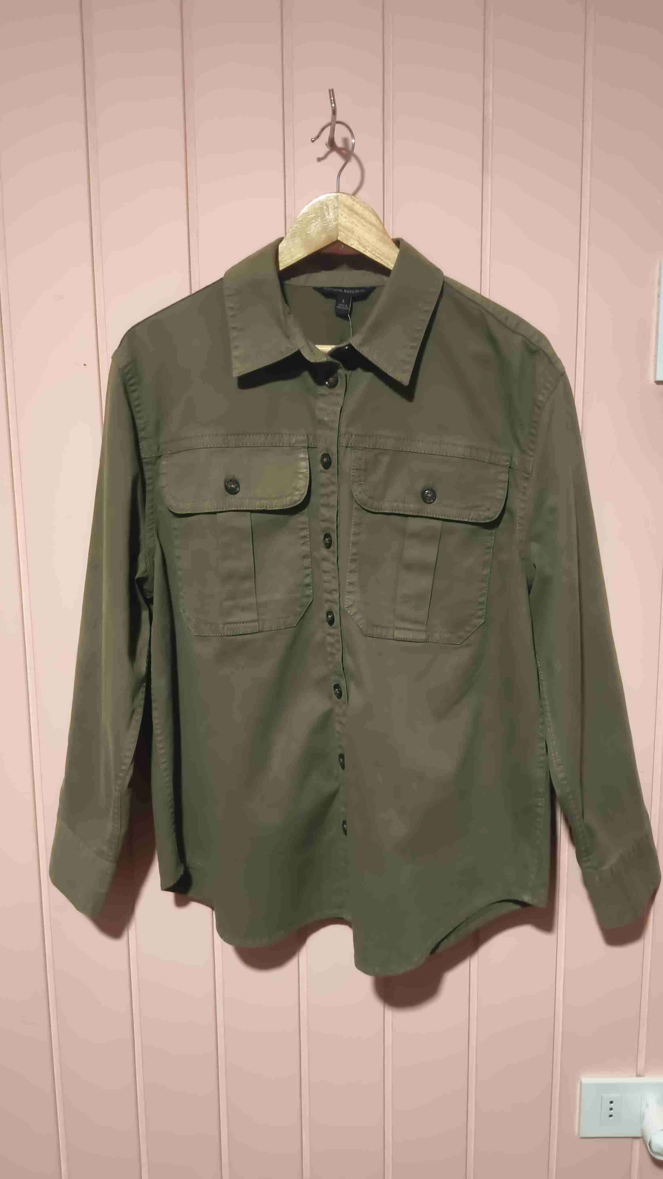Camisa verde olivo para hombre, estilo casual militar con bolsillos frontales 98% algodón Marca Banana Republic Se puede usar como sobre camisa abierta con una polera Precio americano 68.99 dólares, aproximados a pesos chilenos $61.000