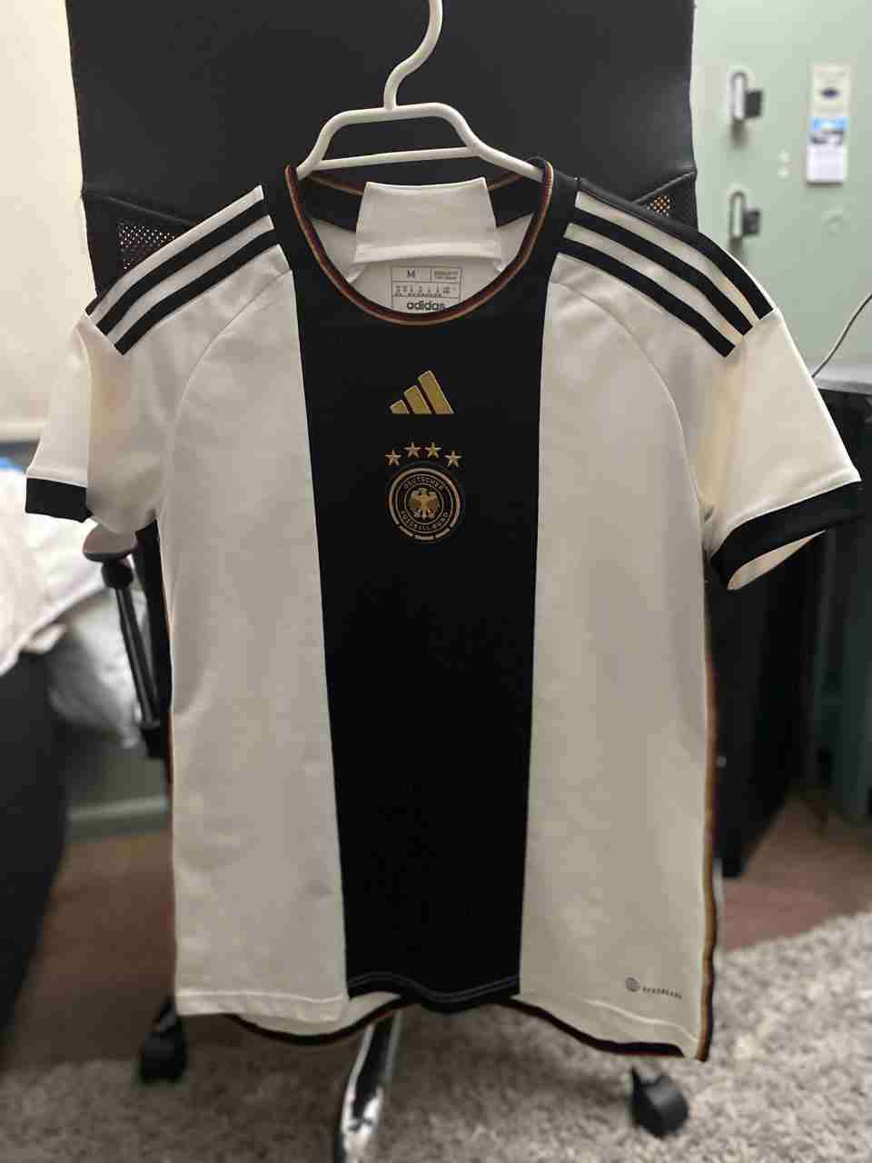 Camiseta deportiva Adidas de Alemania, color blanco y negro, perfecta para fútbol y uso casual. Buen estado general.