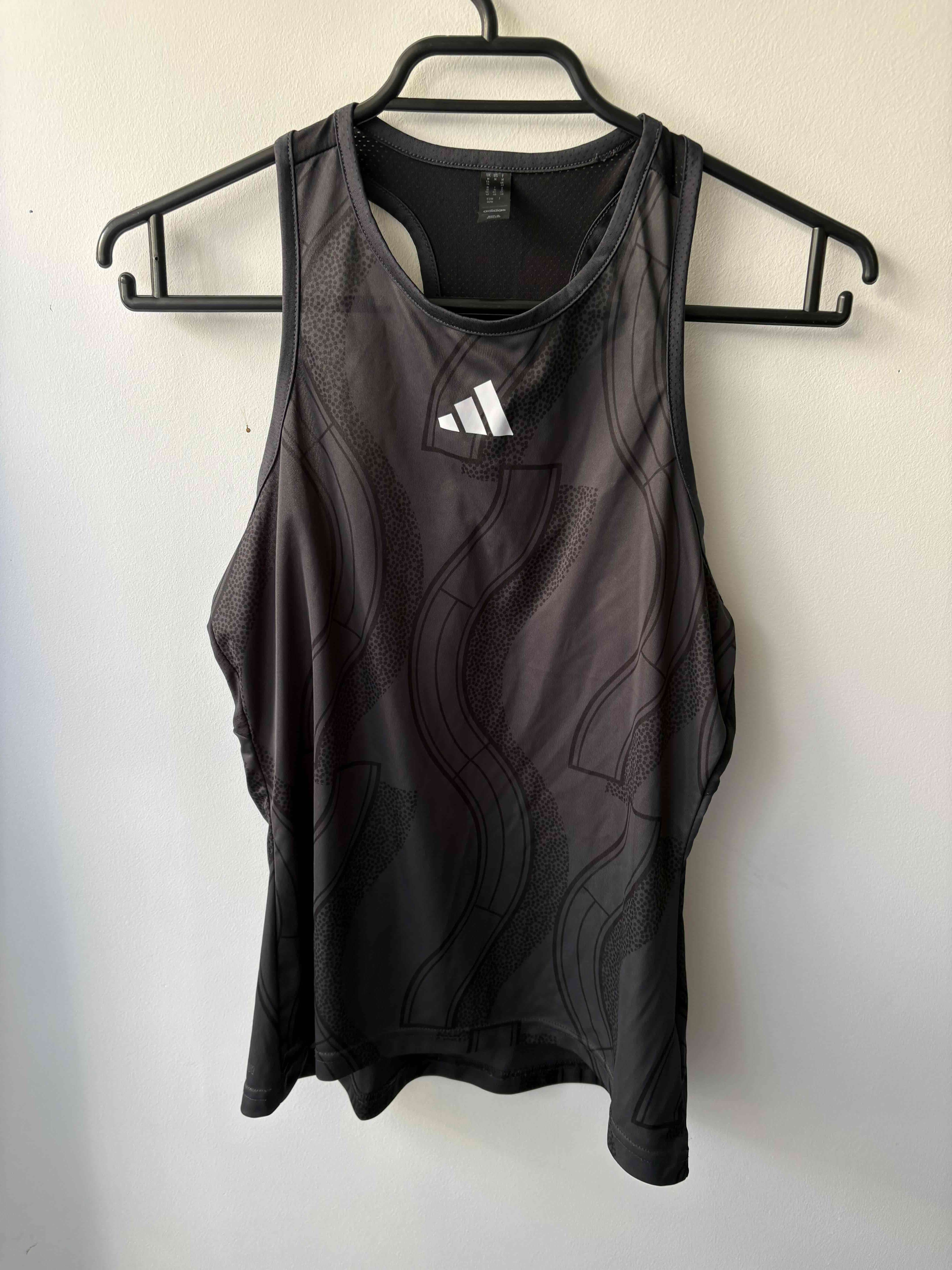Camiseta sin mangas negra con estampado moderno. Ideal para entrenar o uso casual.
