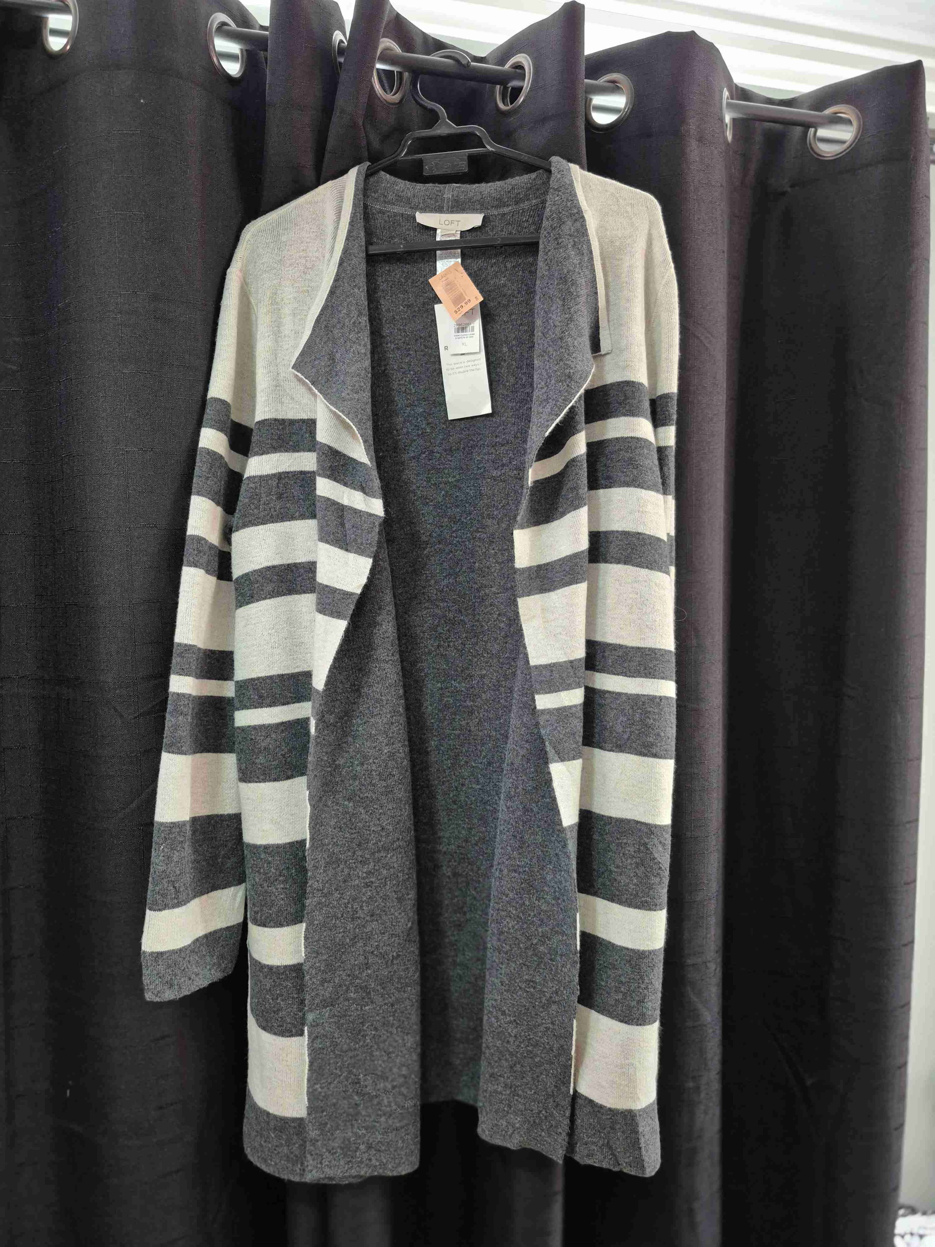 Cardigan en tonos grises y beige con rayas, ideal para días frescos. Está nuevo con etiquetas. Marca loft talla xl reversible.