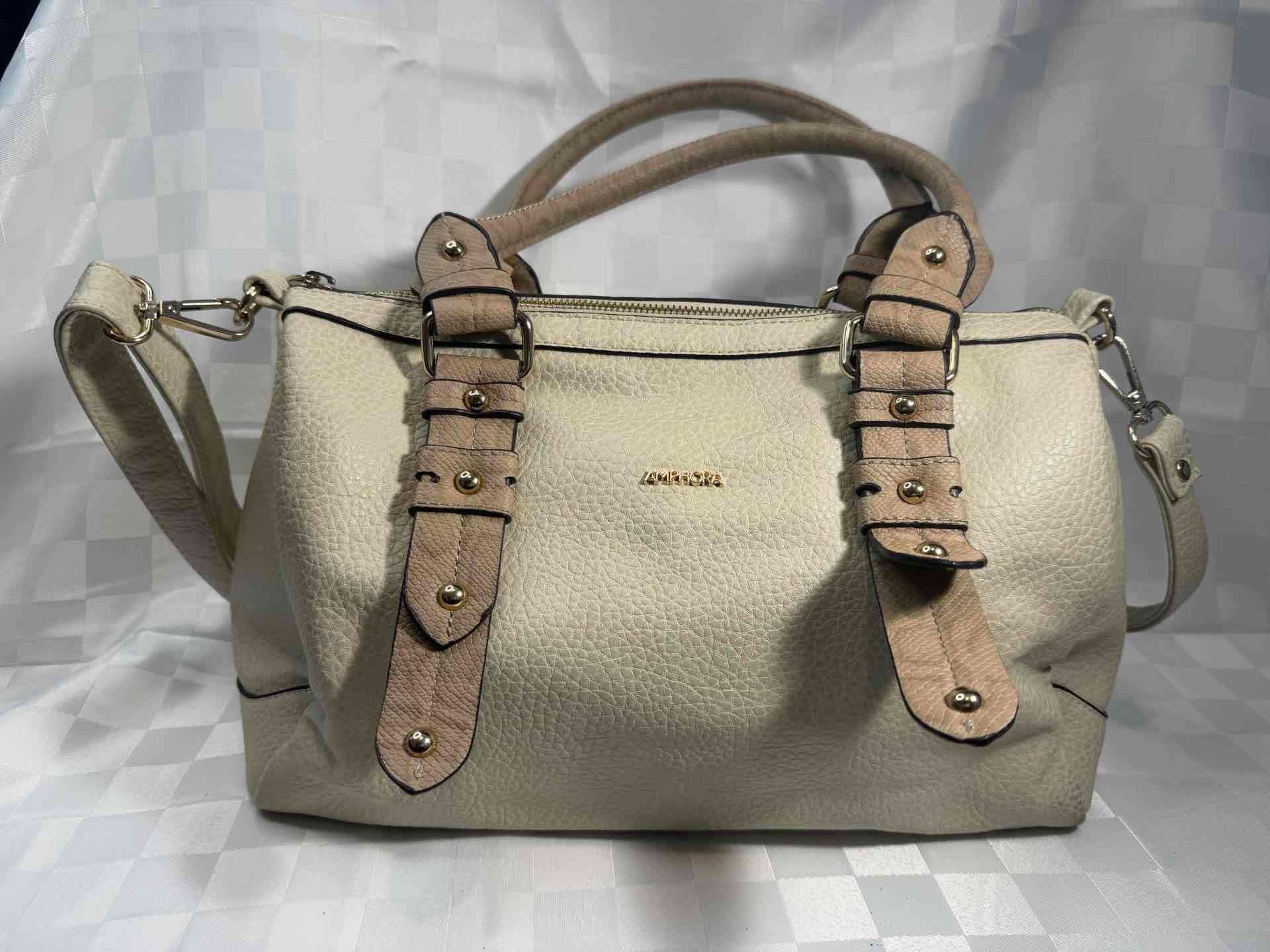 Cartera Amphora elegante de color beige con detalles en hebillas y correa ajustable. Ideal para usos cotidianos con estilo.