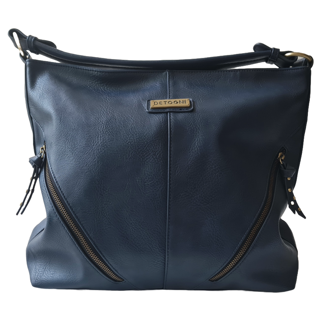 Hermosa cartera de la reconocida marca chilena Detogni. Es muy espaciosa, ideal para llevar todo lo necesario del día a día. Marca: Detogni (Original). Composición: Exterior: 100% Poliuretano, Forro: 100% Poliéster Compartimientos: Amplio espacio principal, cierres laterales decorativos/funcionales. Asas: Cómodas para colgar al hombro. Color: Azul Marino (Navy) Medidas: 40cm ancho, 33cm largo, 12cm profundidad Producto: Nuevo