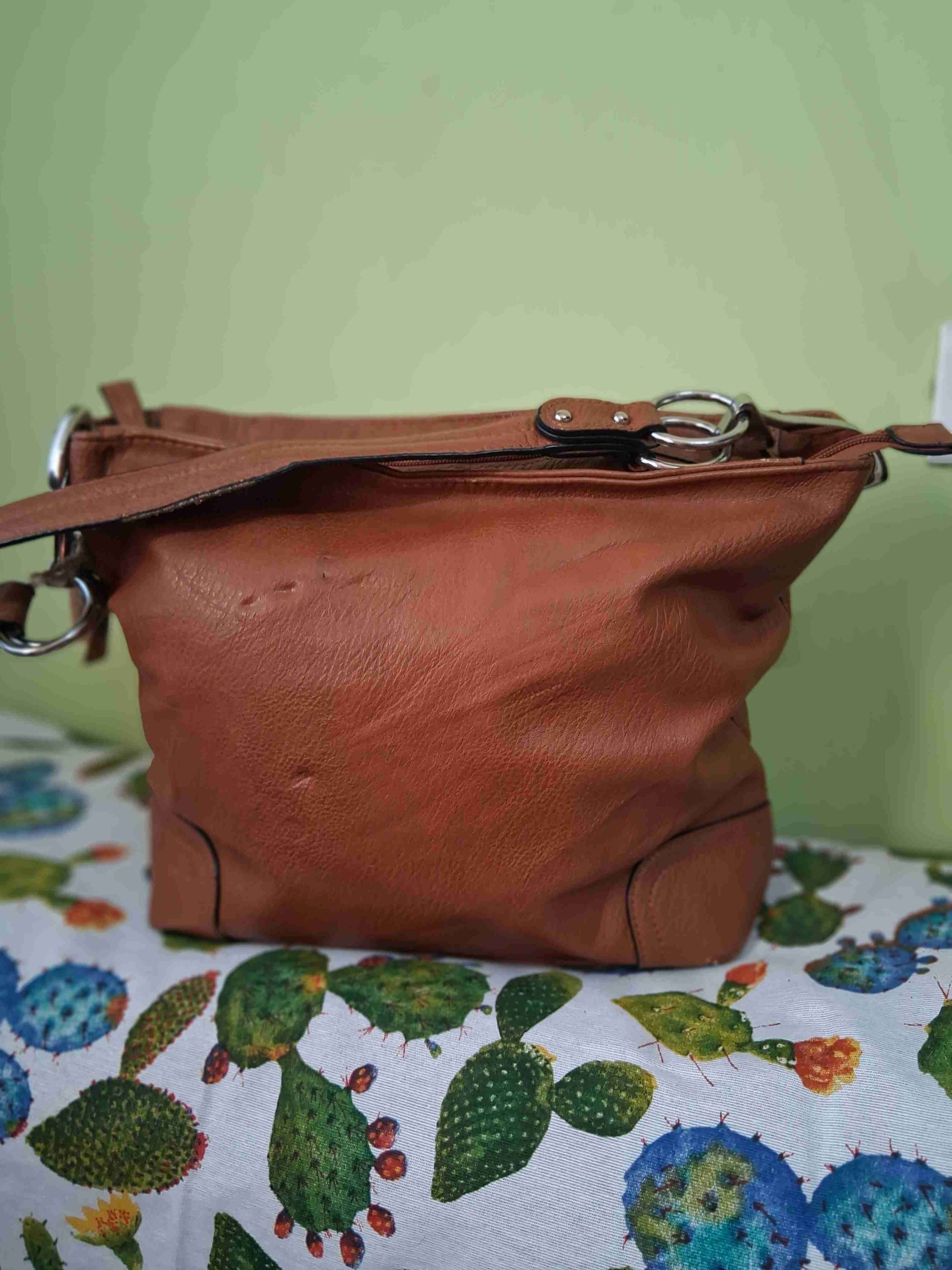 Cartera d color café con correa ajustable. En buen estado, ideal para uso diario.