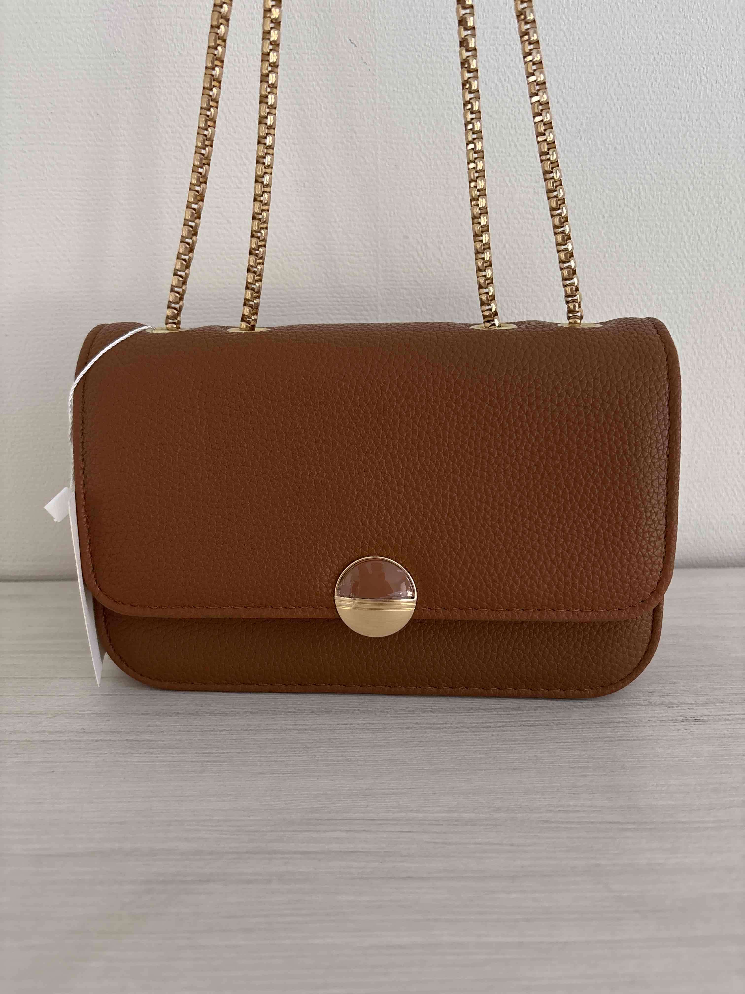 Elegante cartera en tono café claro, ideal para cualquier ocasión. Nueva con etiquetas. La cadena si la tomas doble queda más corta pero puede alargarse y quedar de una fila