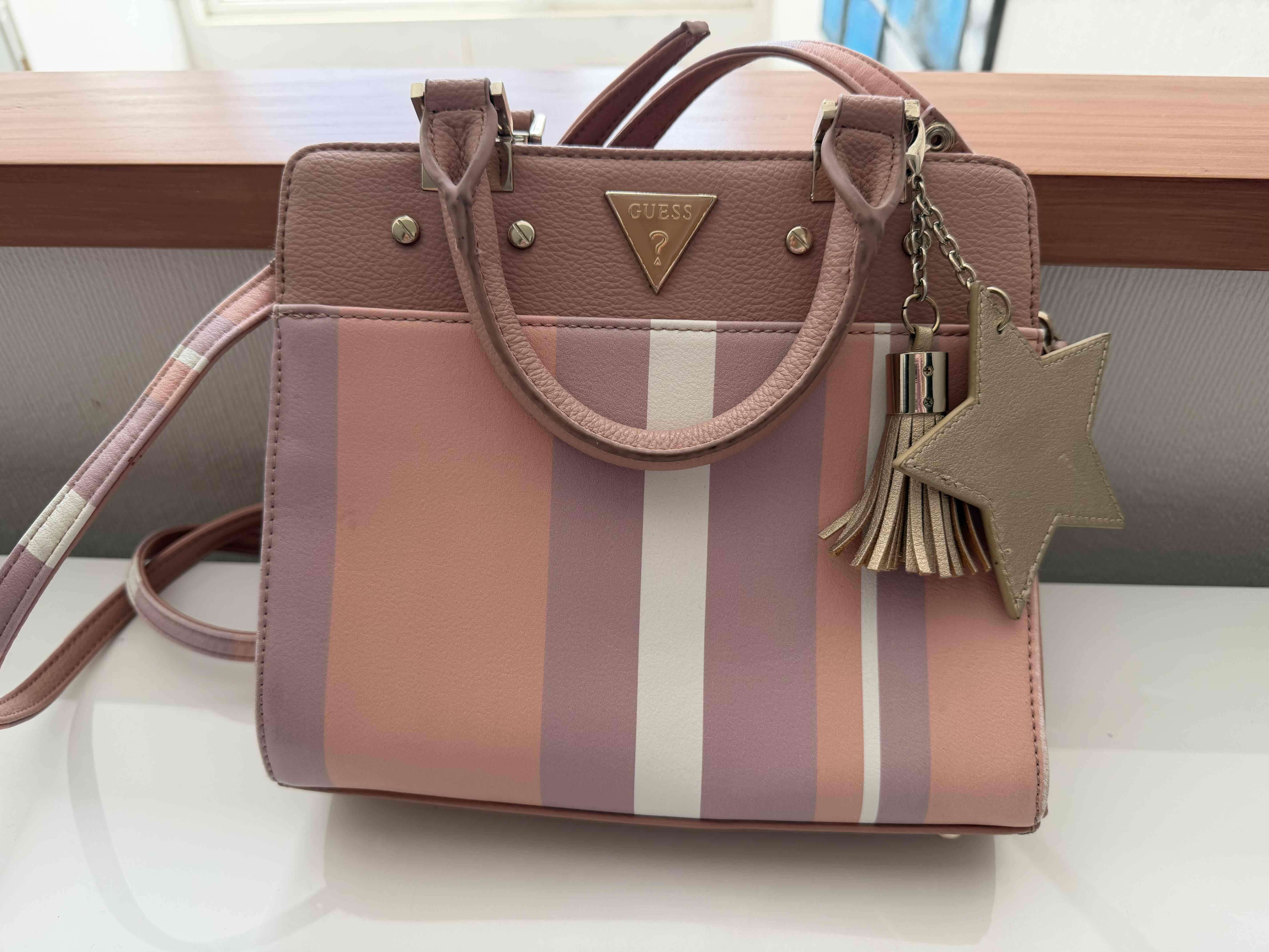 Cartera Guess en tonos pastel con diseño de rayas, ideal para un look casual. Incluye accesorio de estrella y borla decorativa. En buen estado general.