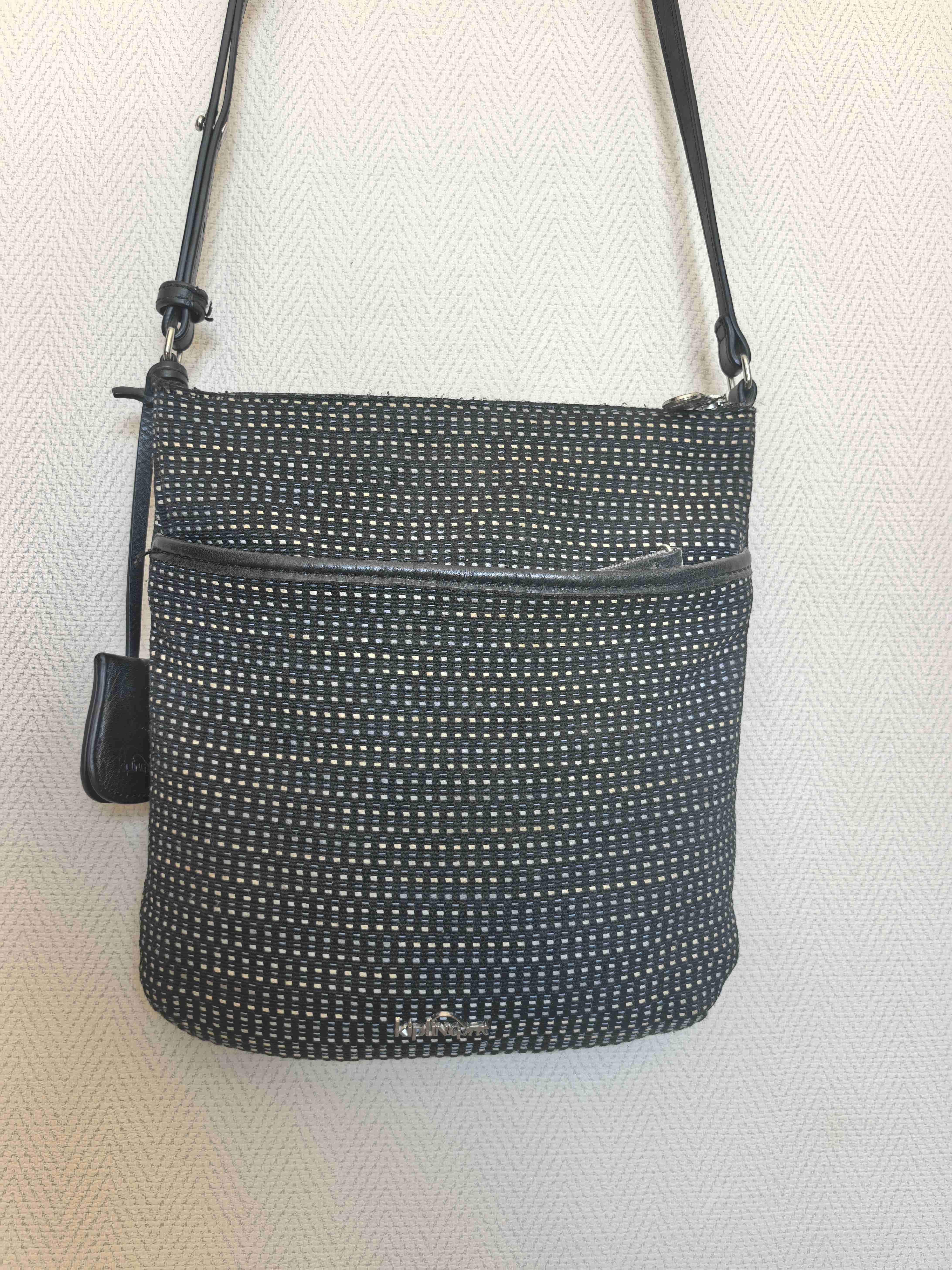 Cartera bandoleraKipling de tela negra con estampado blanco.