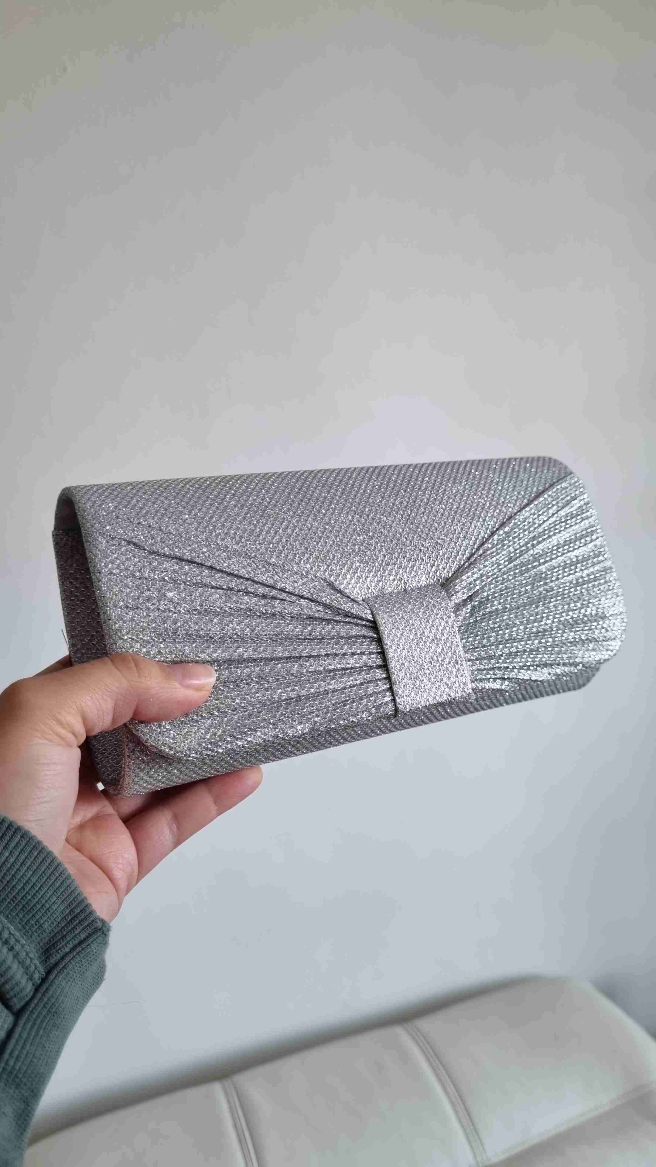 Elegante cartera de fiesta color plateado con brillo. Ideal para eventos y ocasiones especiales.