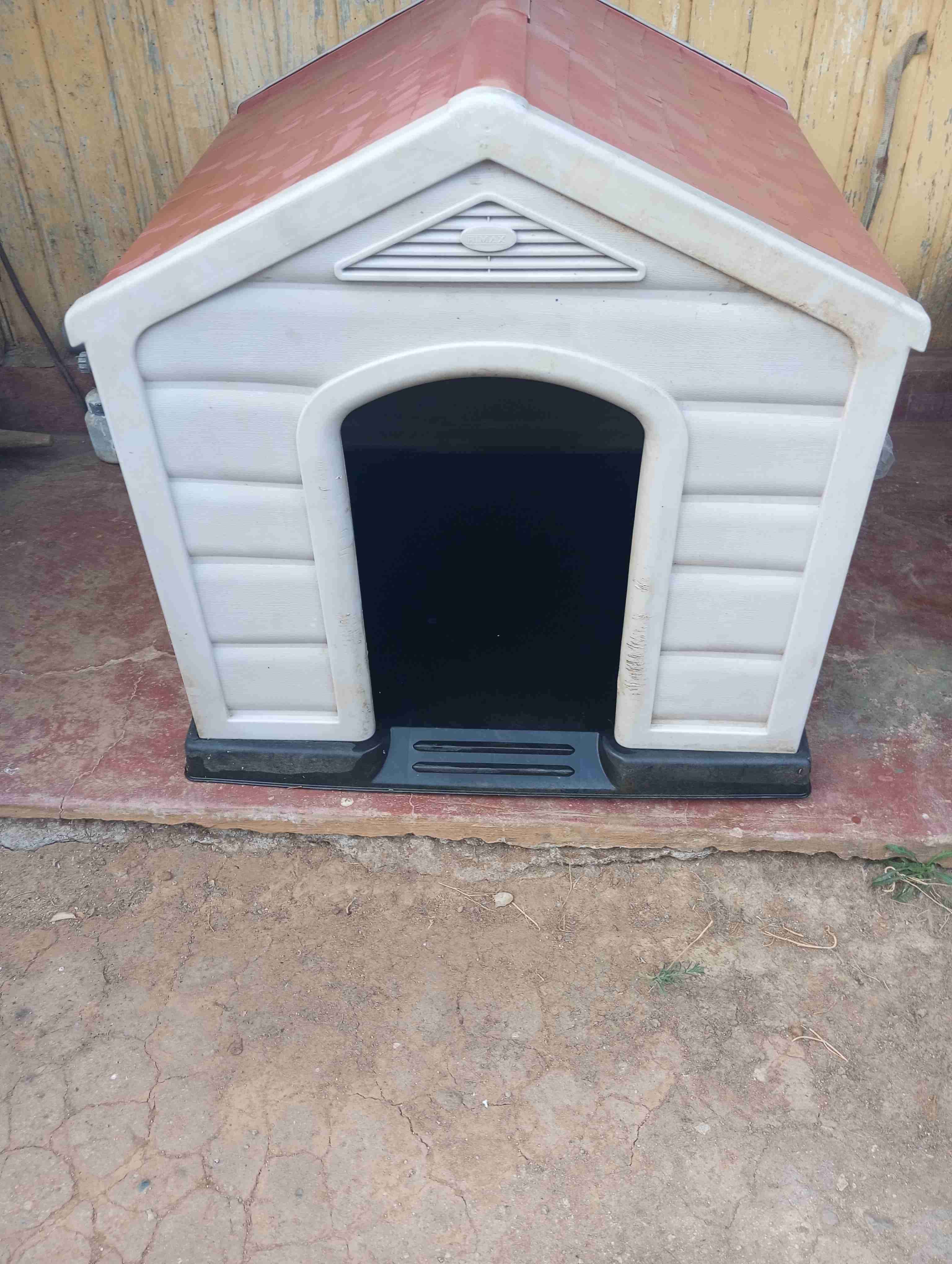 Casa de perro de plástico, techo rojo. Ideal para exteriores, en buen estado.