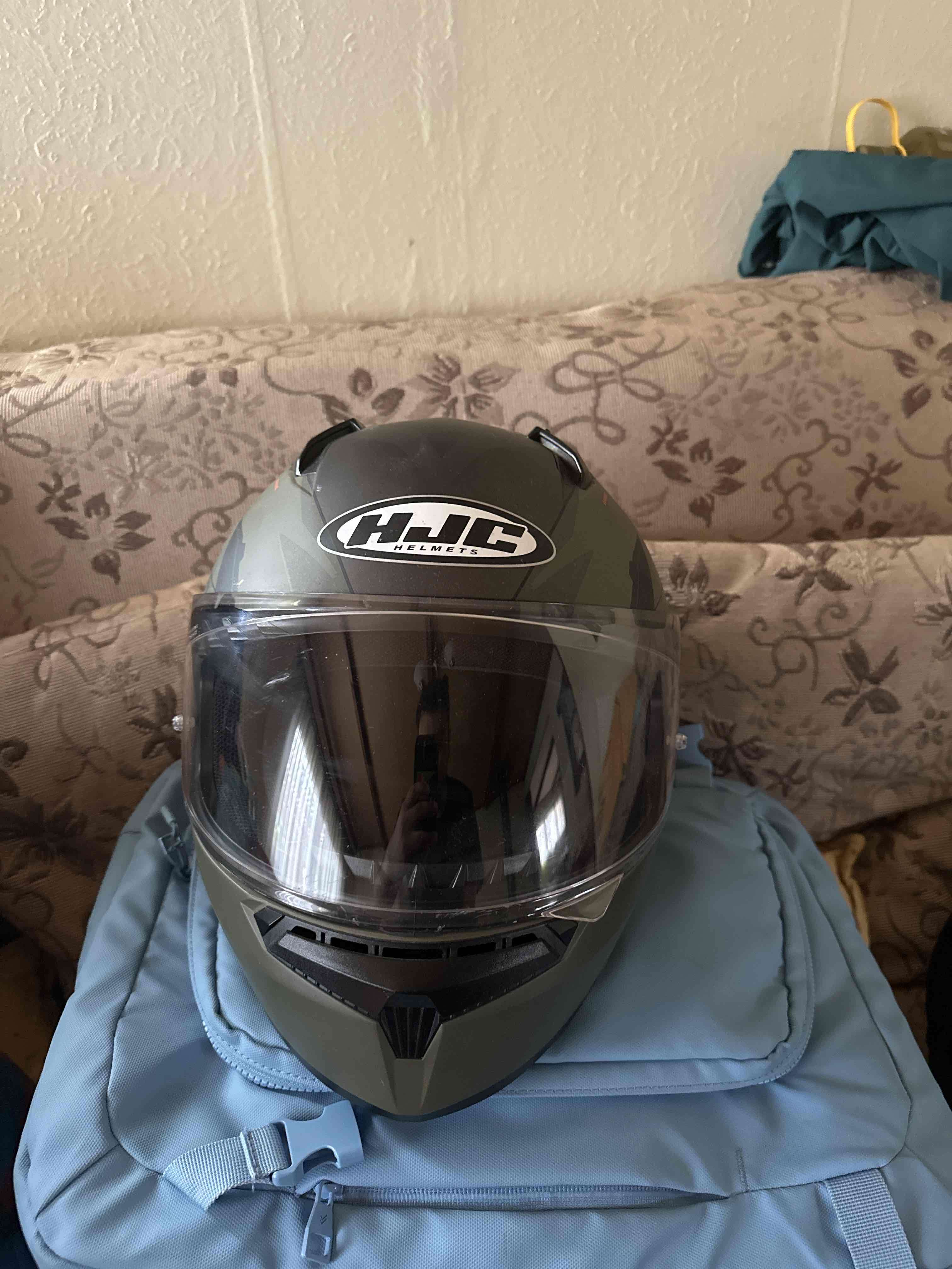 Casco HJC en buen estado, color verde con gris mate. Ideal para motociclismo.