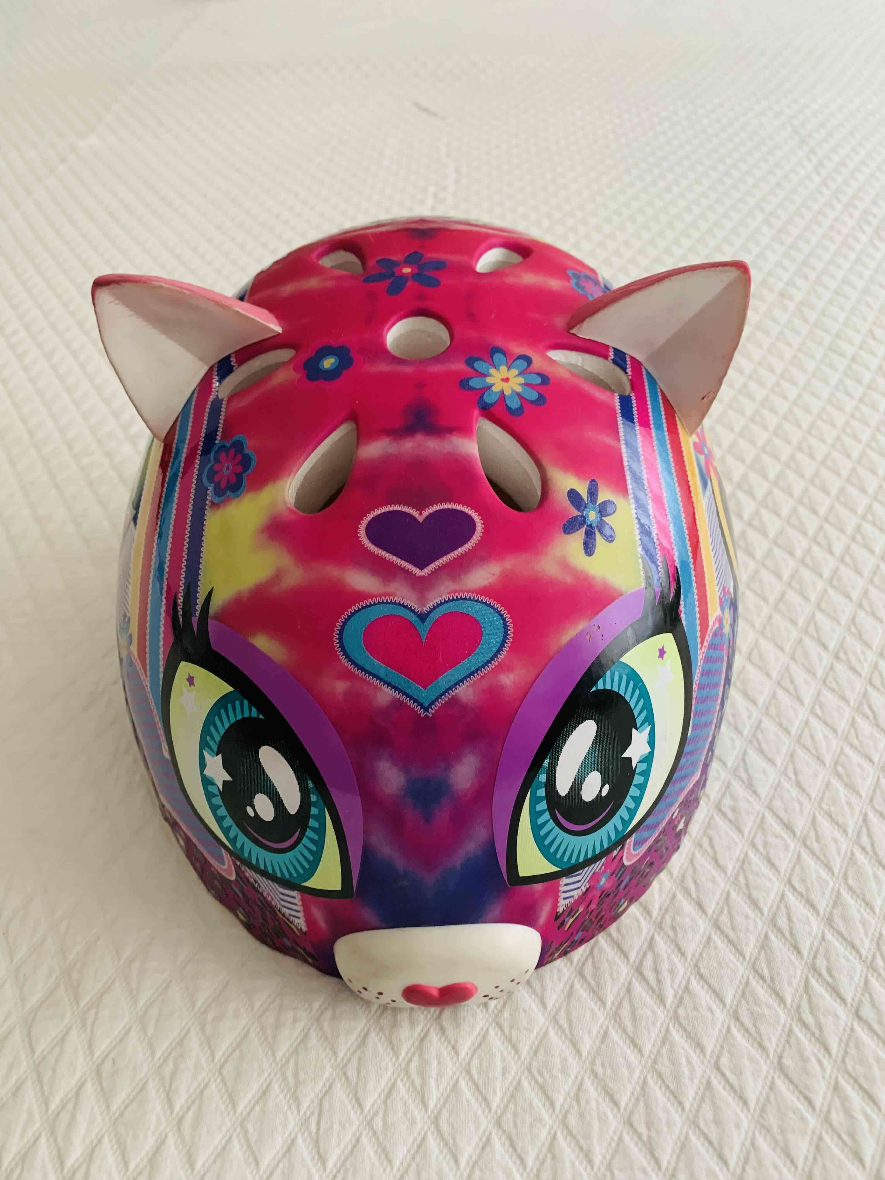 Casco para niños marca Raskullz Sparklez con diseño de gatito y colores vivos. Ideal para proteger durante juegos o ciclismo. En buen estado. Talla XS (48-52cm).
