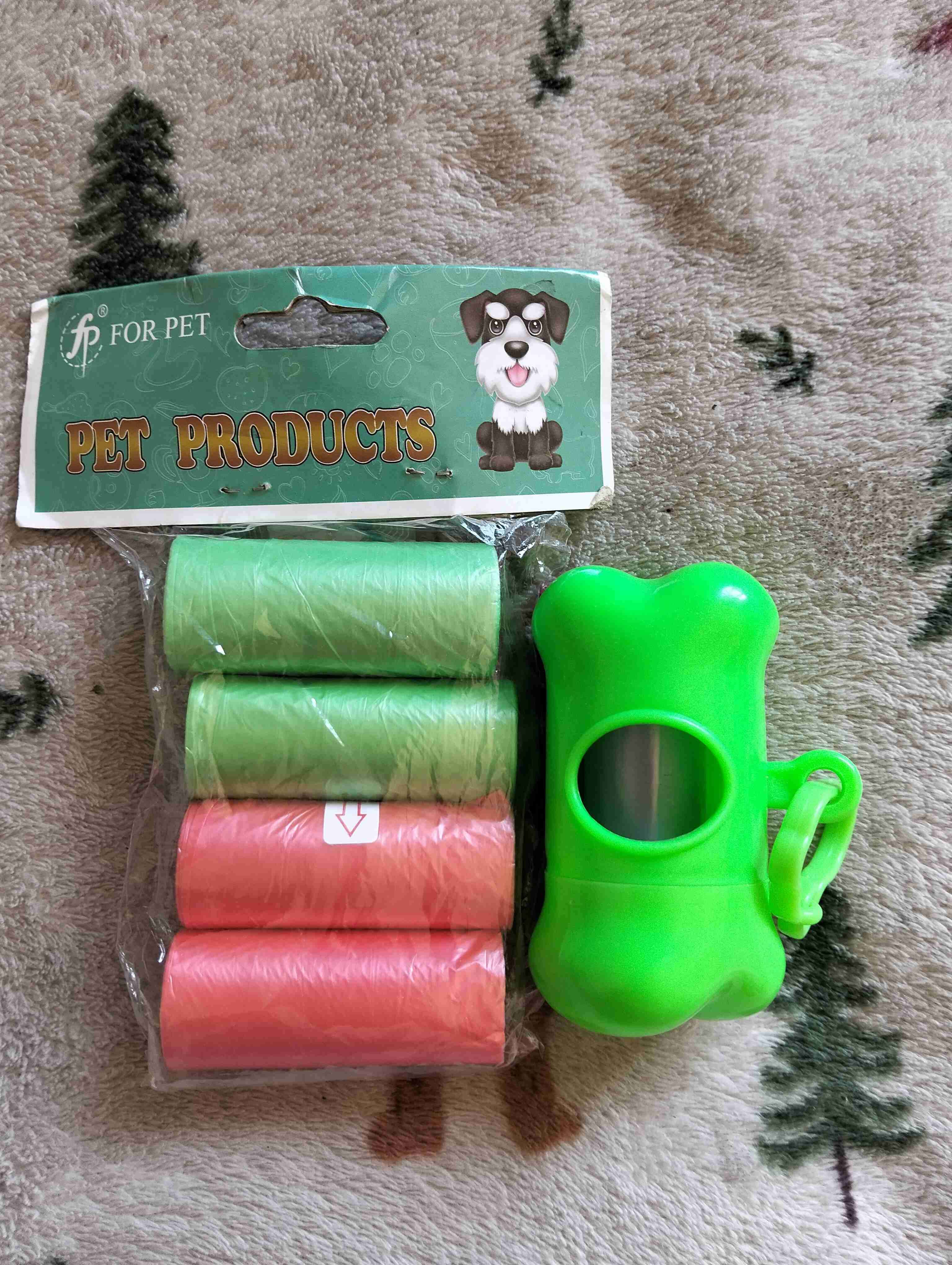 Práctico dispensador con bolsas para recoger desechos de mascotas. Incluye varios rollos de colores. Ideal para paseos.