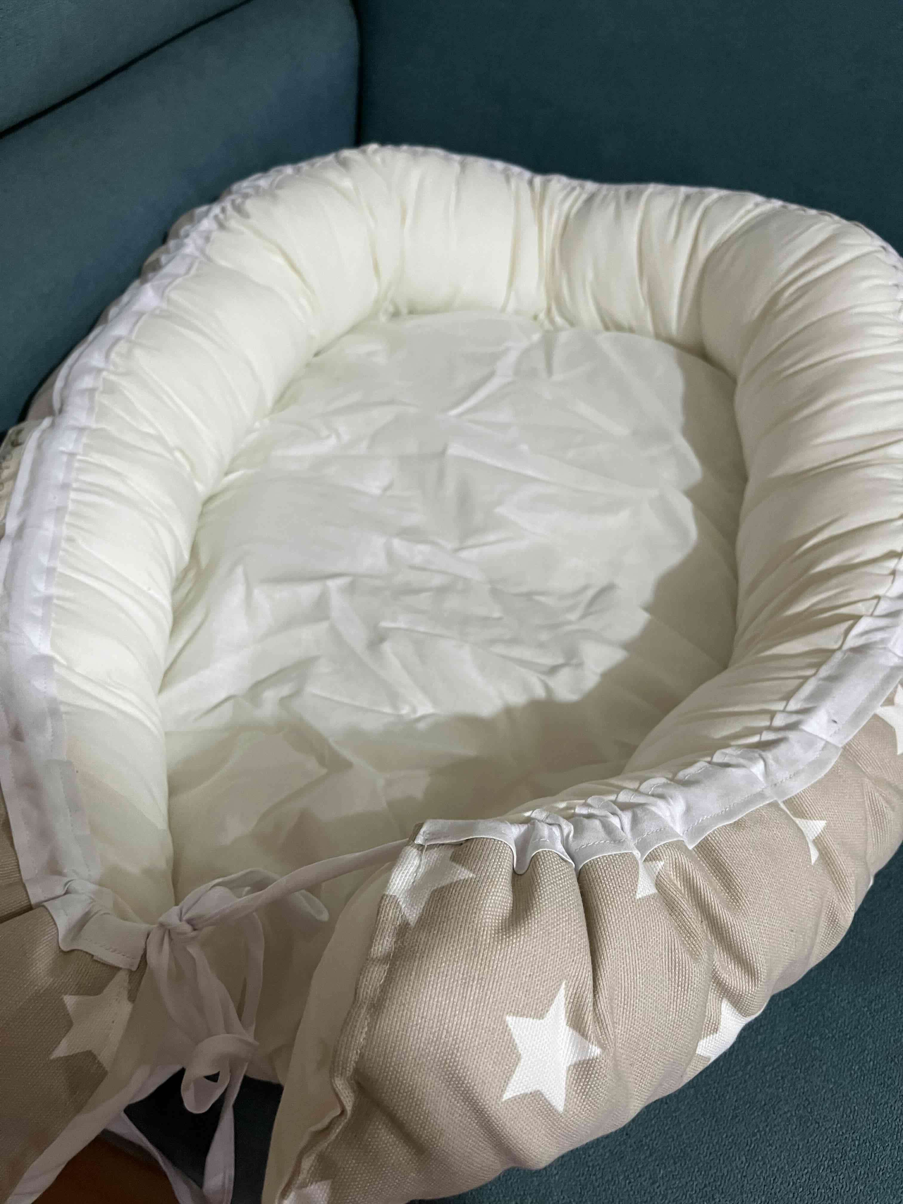 Cuna nido en color beige con estampado de estrellas. Ideal para mantener al bebé cómodo y seguro. Estado general bueno.