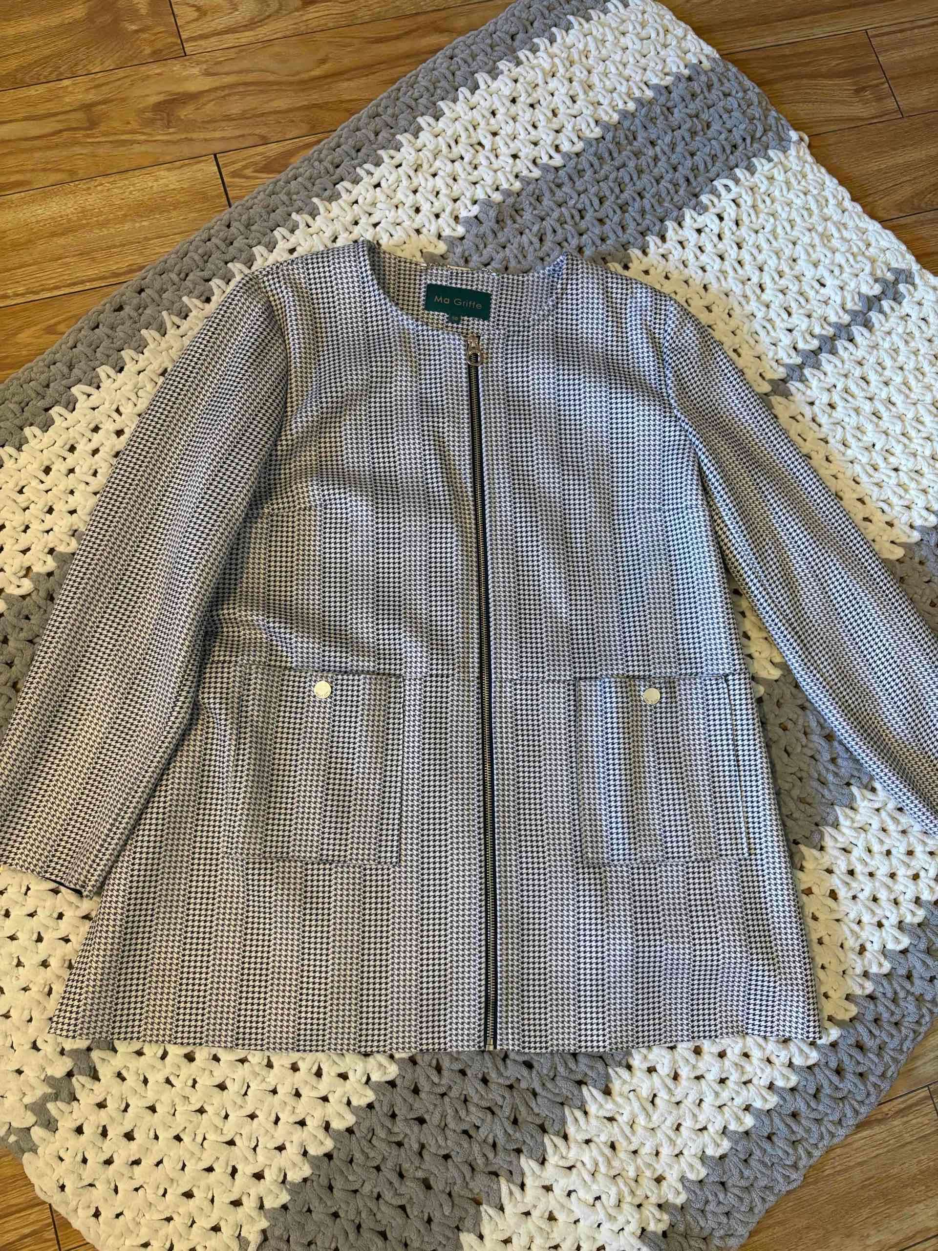 Abrigo gris a cuadros para mujer, perfecto para el invierno. En buen estado, con detalles elegantes para el día a día.