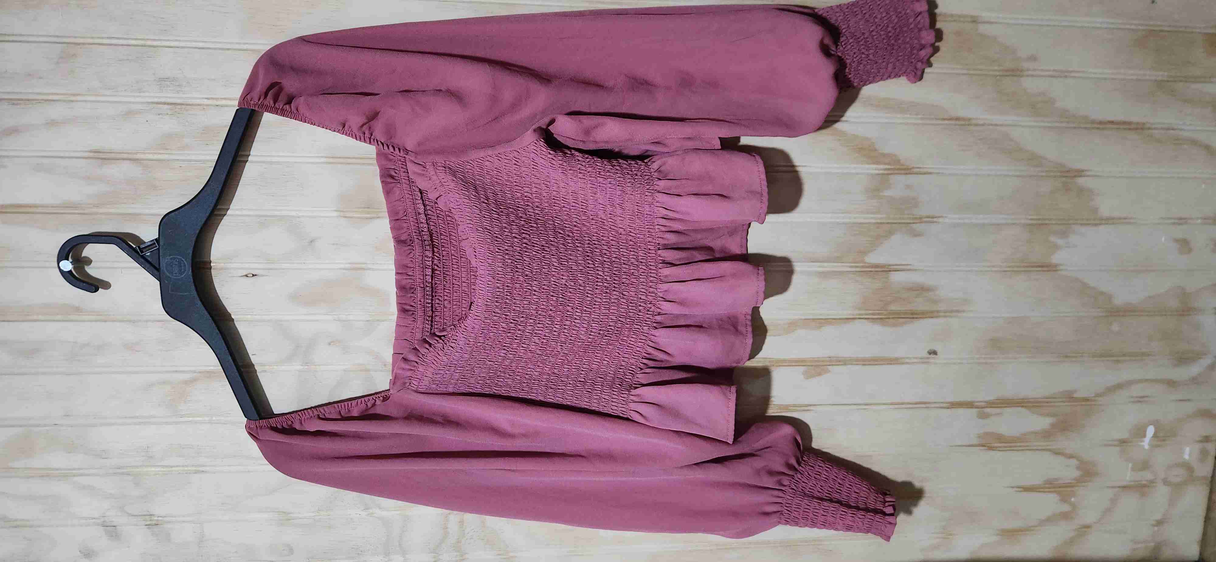 Blusa rosa con mangas largas abullonadas, ideal para un look casual y cómodo. En buen estado.