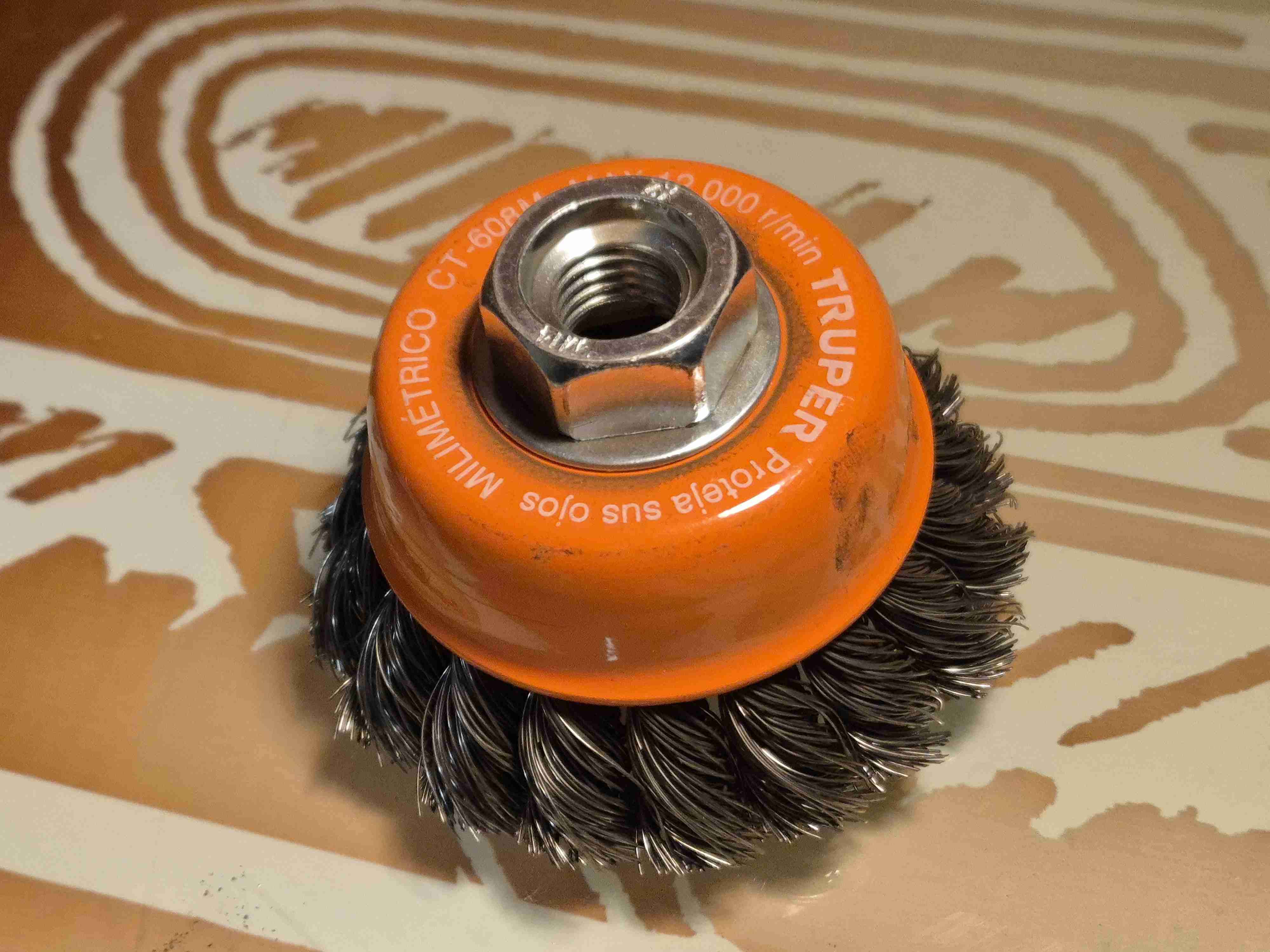 Cepillo copa alambre trenzado 75mm para esmeril angular, ideal para limpieza y desbaste. En buen estado, con poco uso.