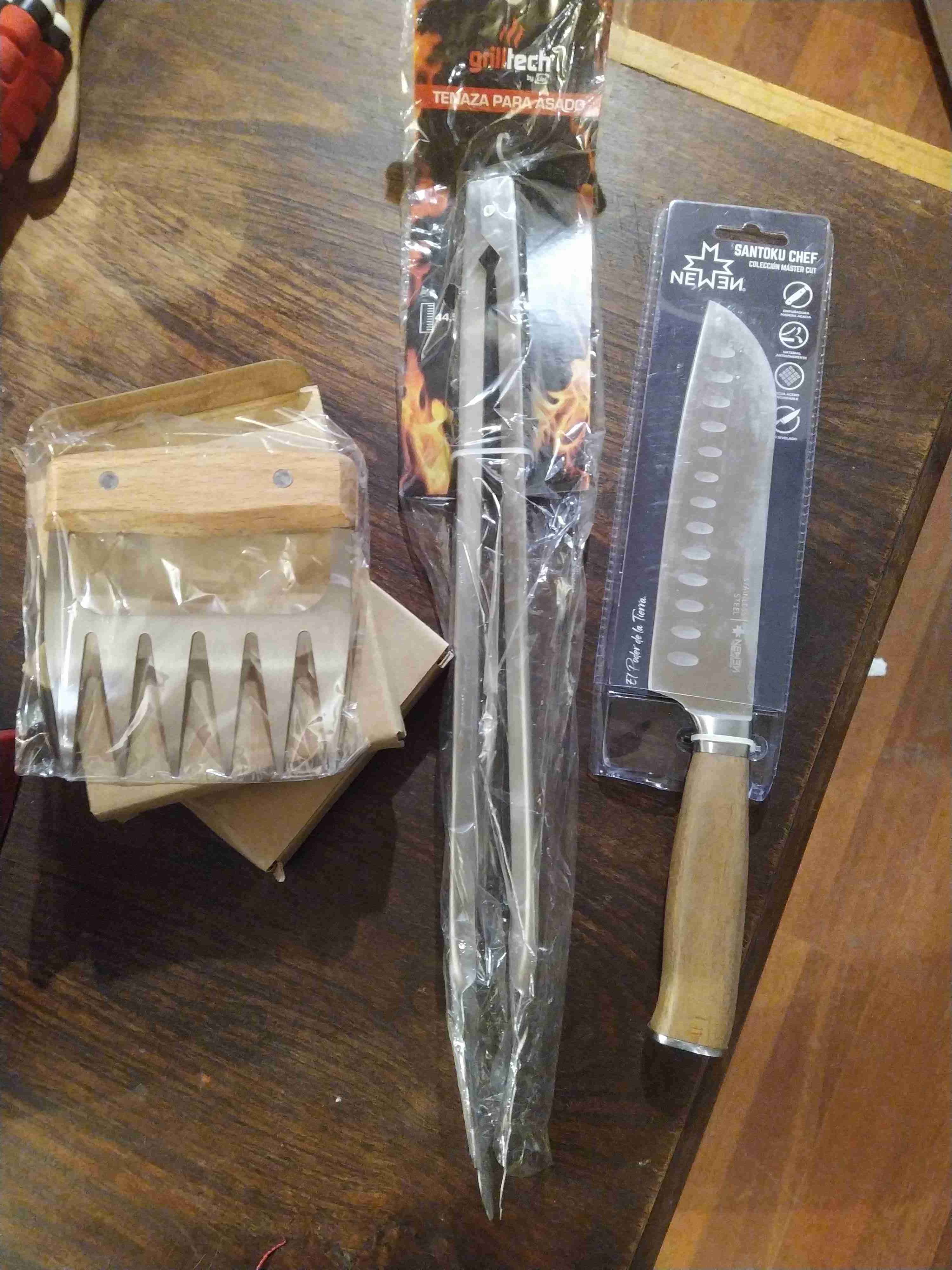 Incluye cuchillo santoku, tenaza y 2 garras para carne. Ideal para parrillas. Estado nuevo en empaque original.
