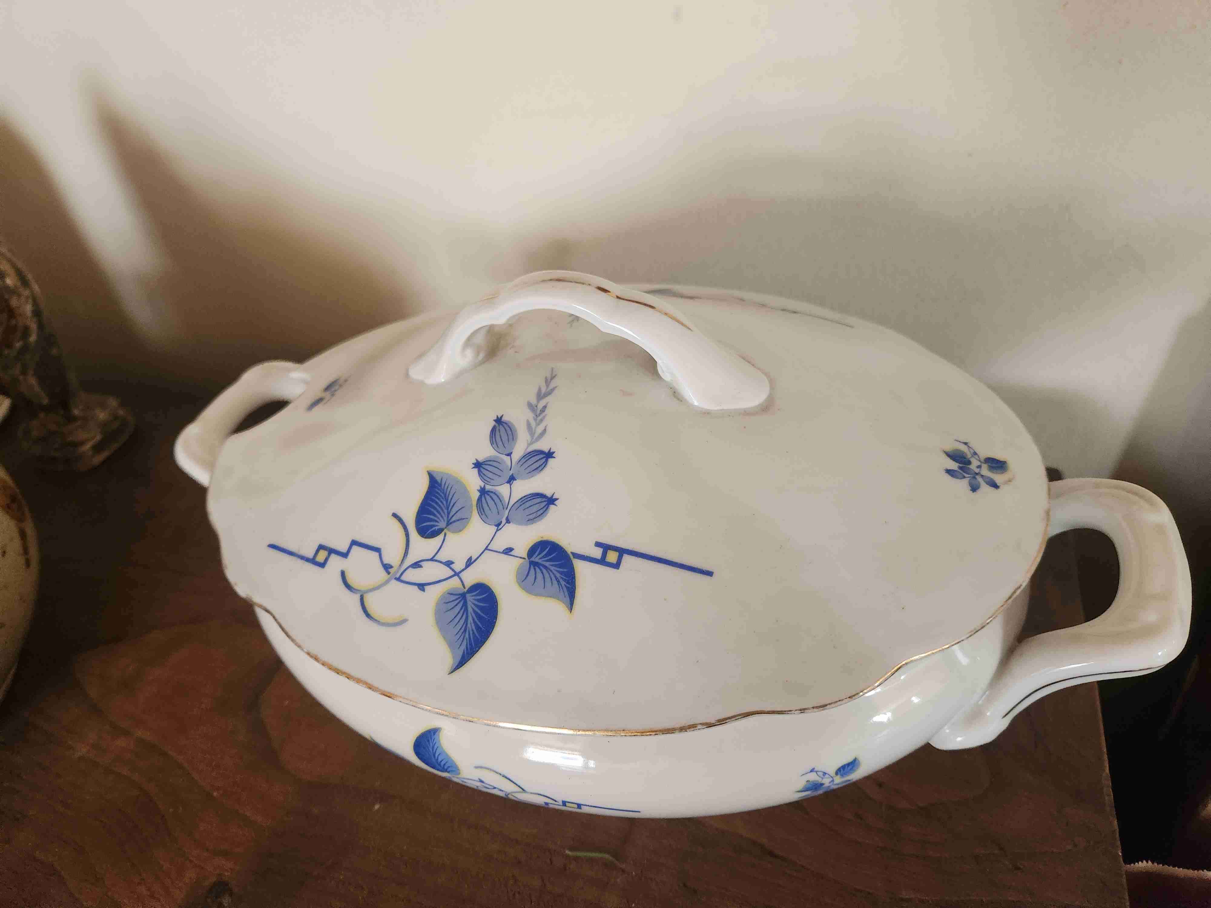 Juego de fuentes de loza con diseño de flores azules. Ideal para ocasiones especiales.