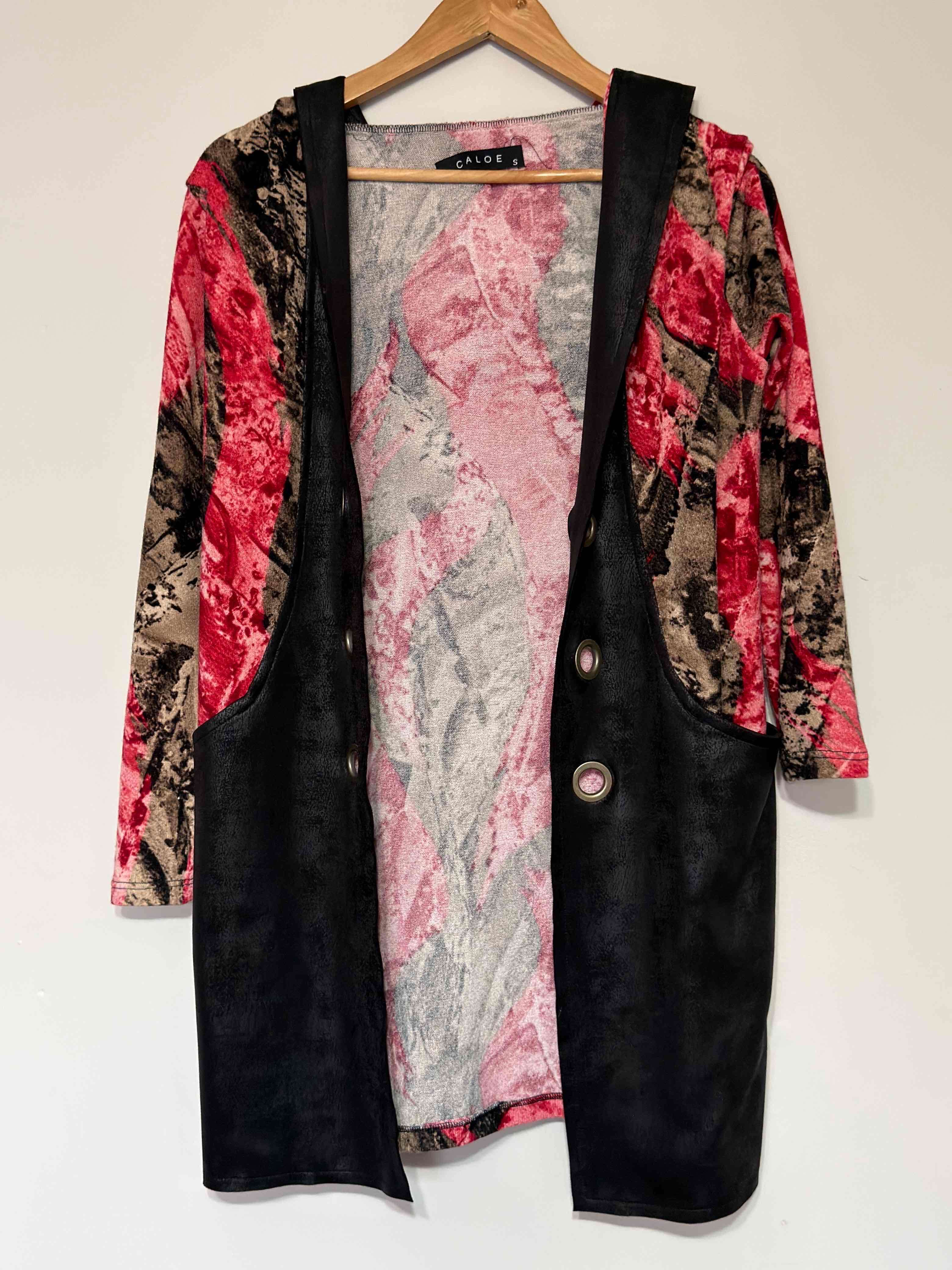 Chaleco con capucha, con estampado colorido y bolsillos. Ideal para un look casual y llamativo. Nuevo sin etiqueta. Talla S pero da para M.