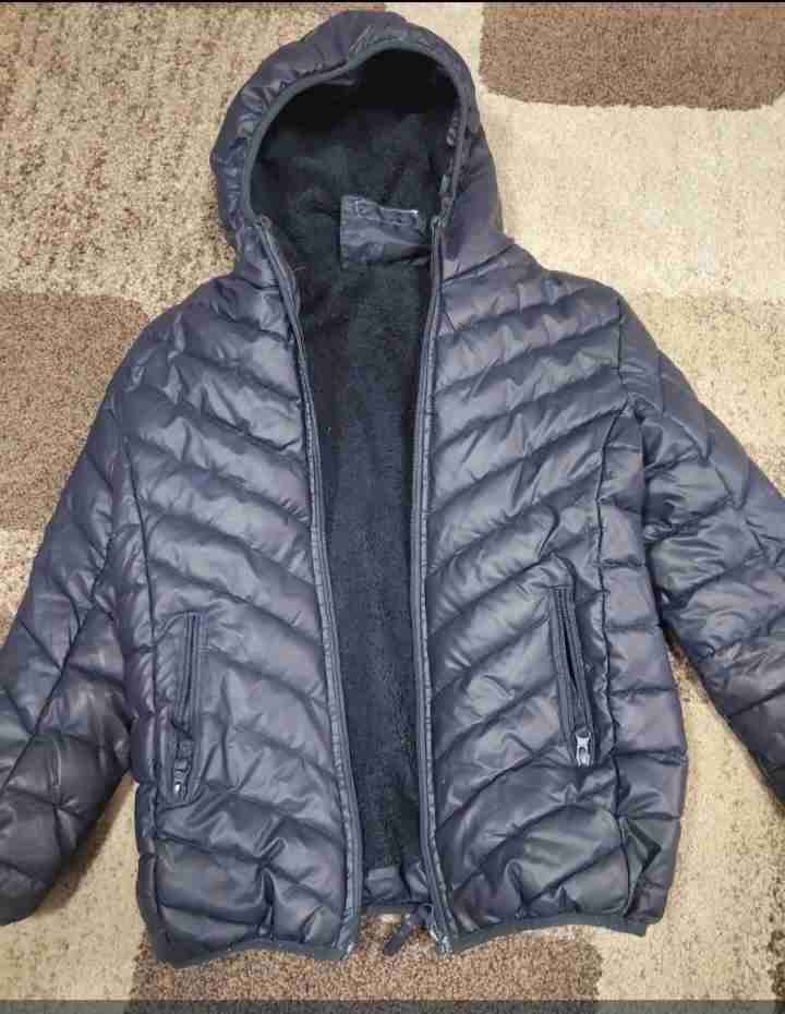 Chaqueta térmica azul ideal para el invierno, con cierre frontal y capucha. En buen estado general. Talla 8-10