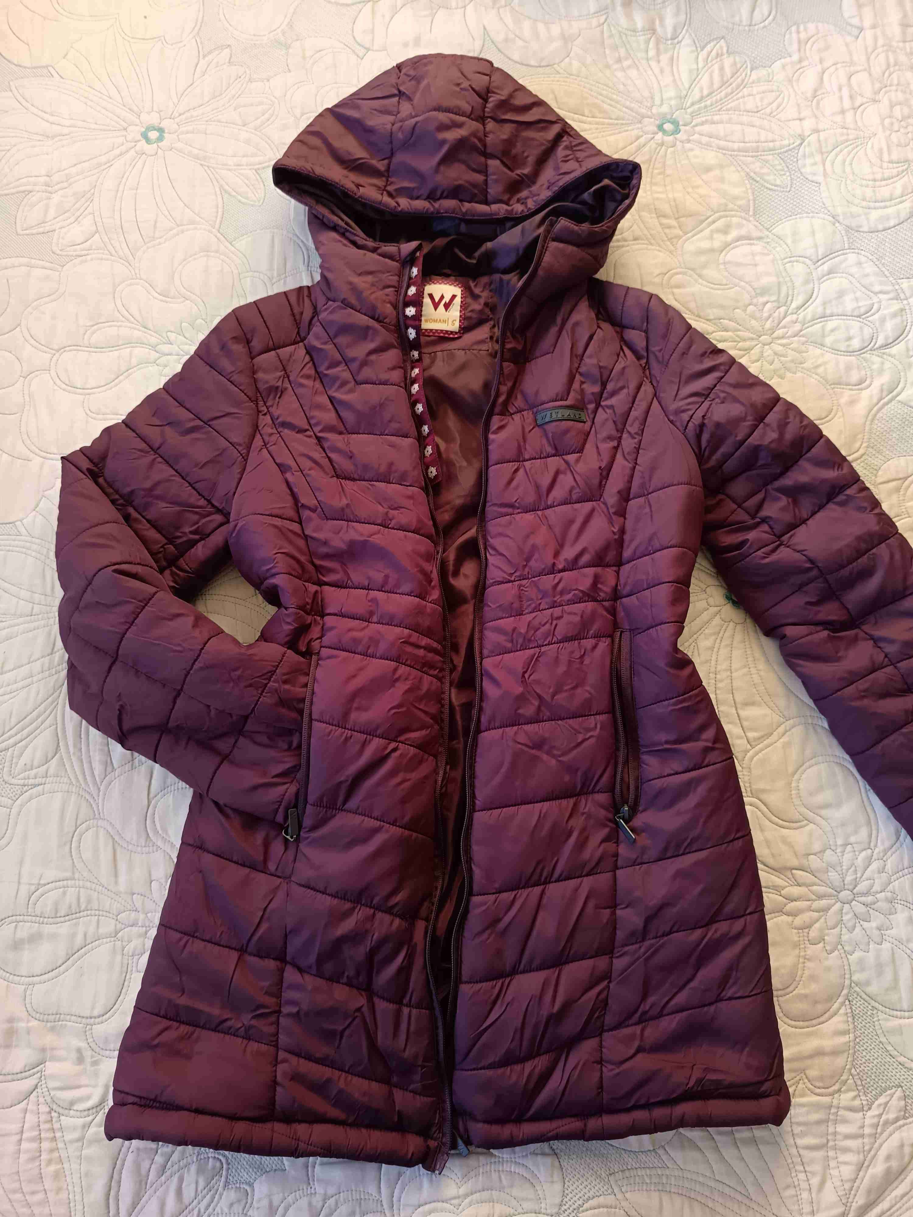 Chaqueta acolchada color burdeos, ideal para el invierno. En buen estado, cuenta con capucha para más abrigo.