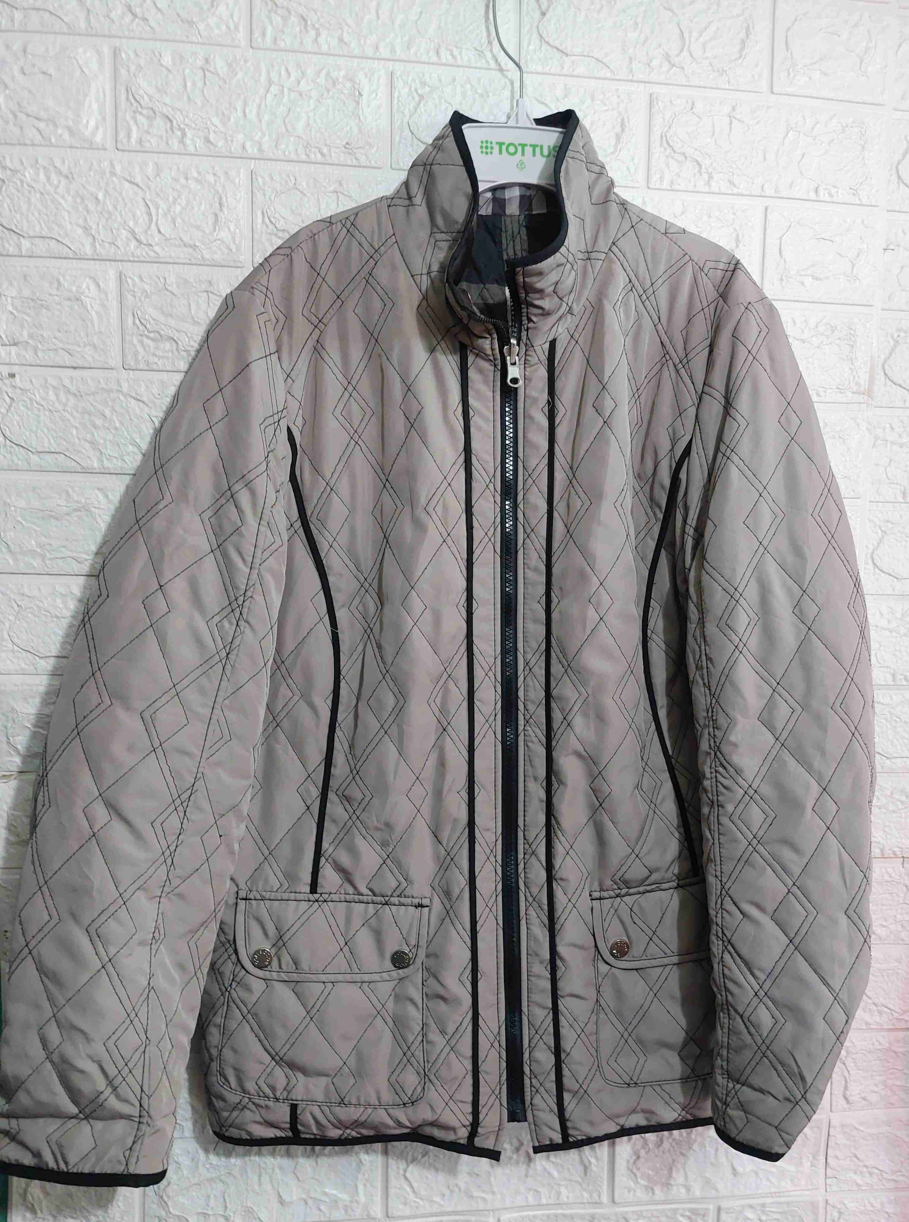 Chaqueta gris acolchada, ideal para el invierno. Está en buen estado general, abrigadora y cómoda. Es reversible