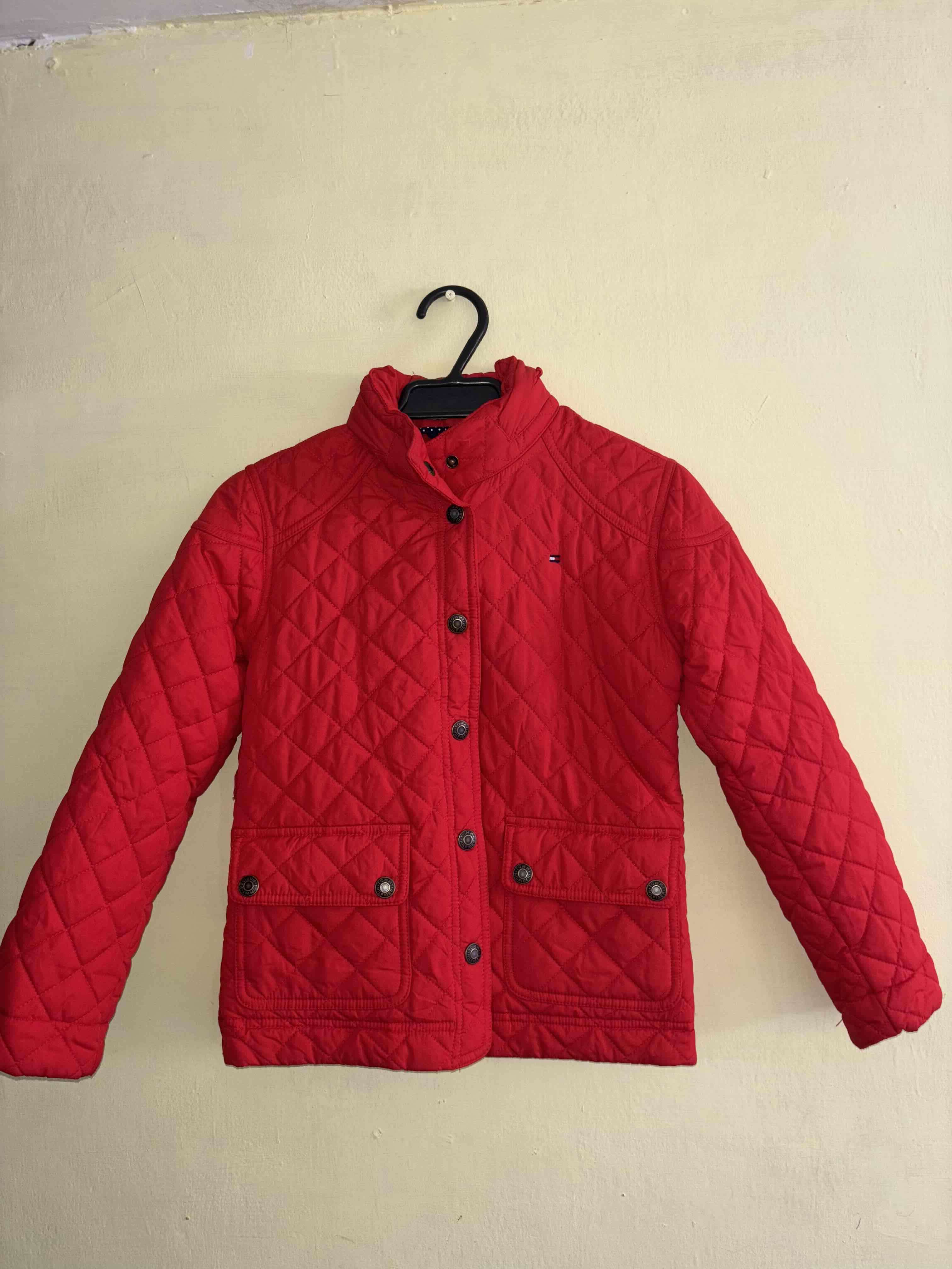 Chaqueta marca Tommy Hilfiger roja acolchada para niña, ideal para el invierno. Talla M (8-10 years) En buen estado con un diseño moderno y abrigador.