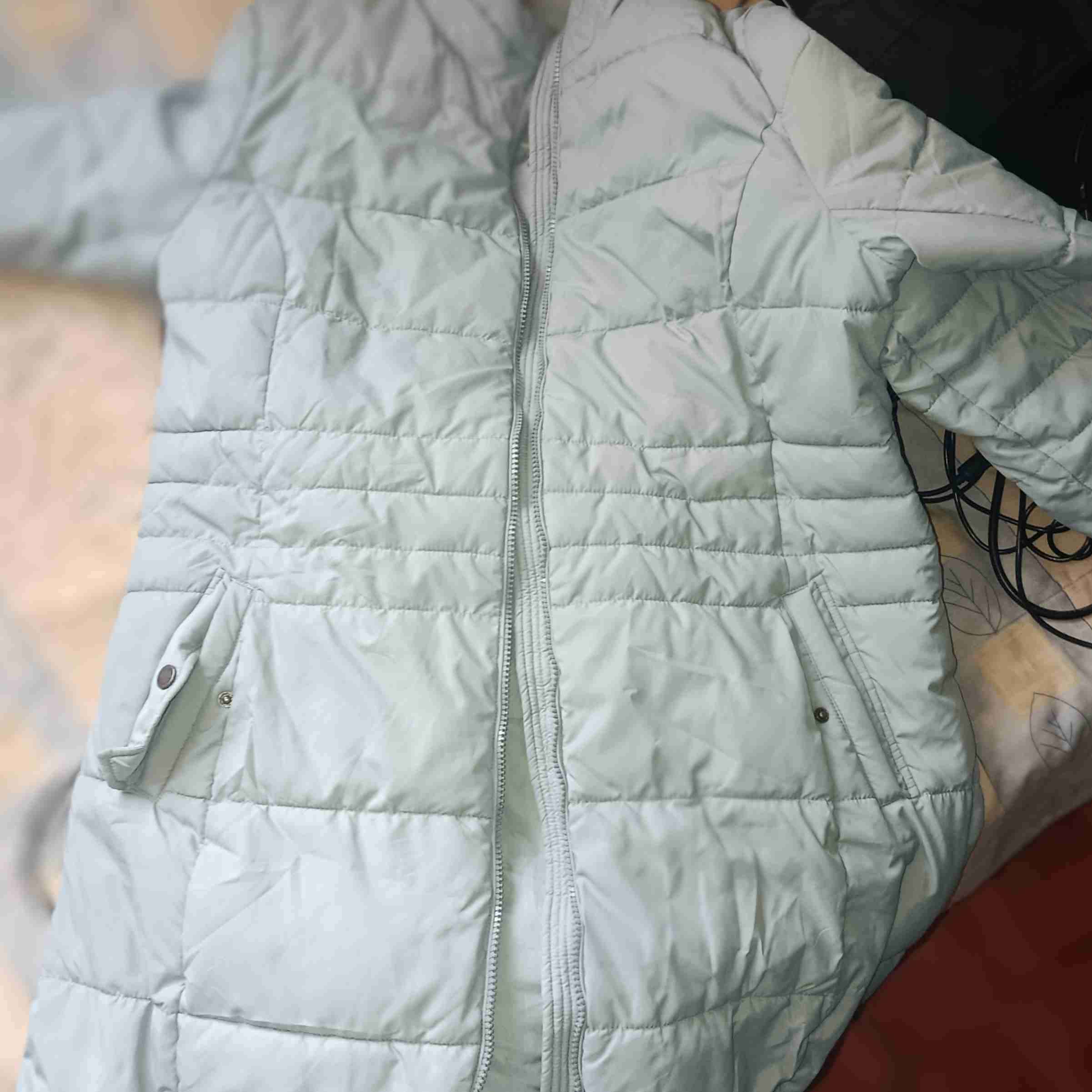 Chaqueta larga acolchado en color celeste, ideal para invierno. Buen estado general con leves señales de uso.