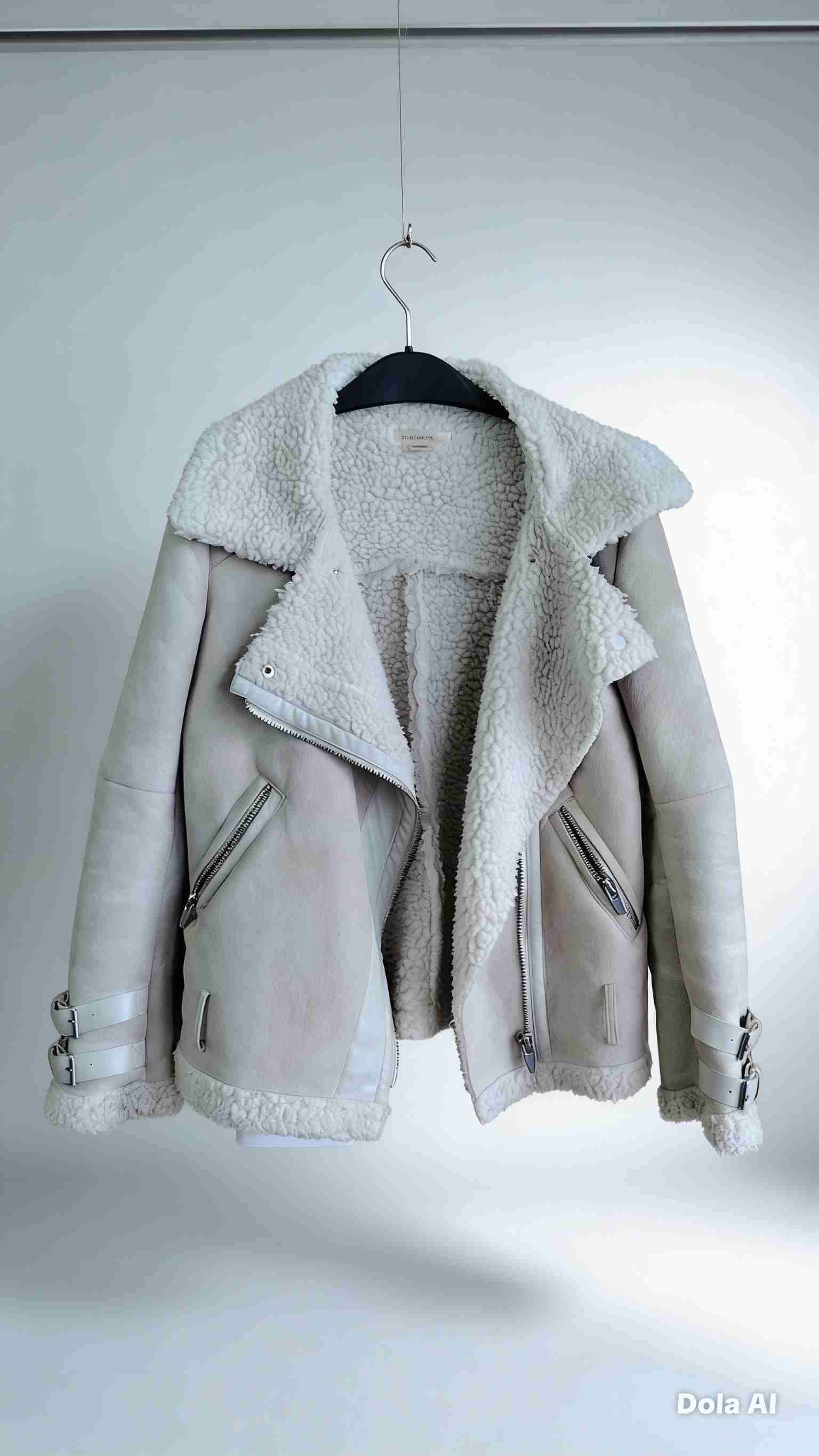 Chaqueta abrigada de piel sintética beige con detalle de cremallera y cuello de borrego. Perfecta para el invierno.