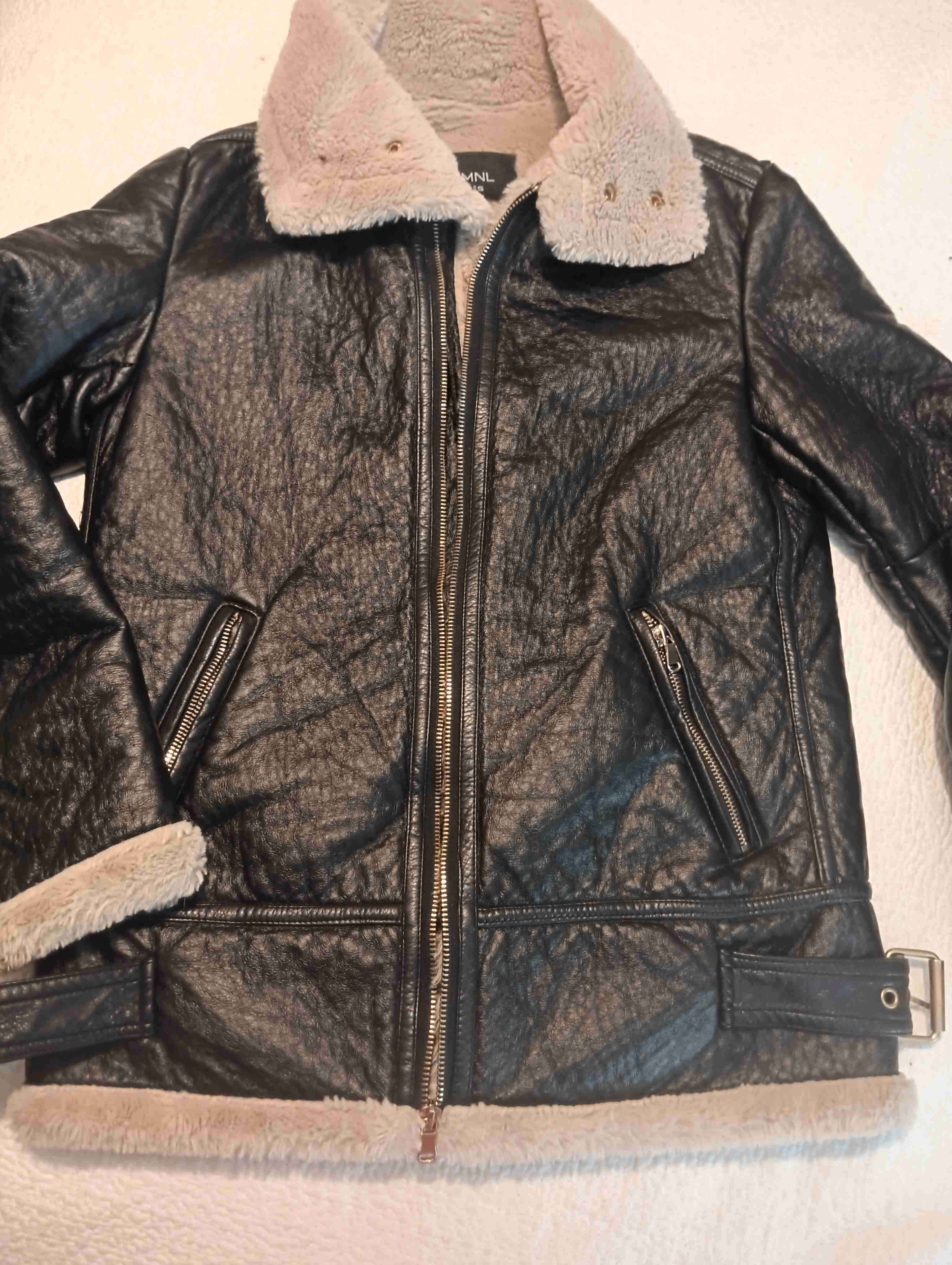 Chaqueta aviadora negra con forro de piel sintética. En buen estado, perfecta para invierno.
