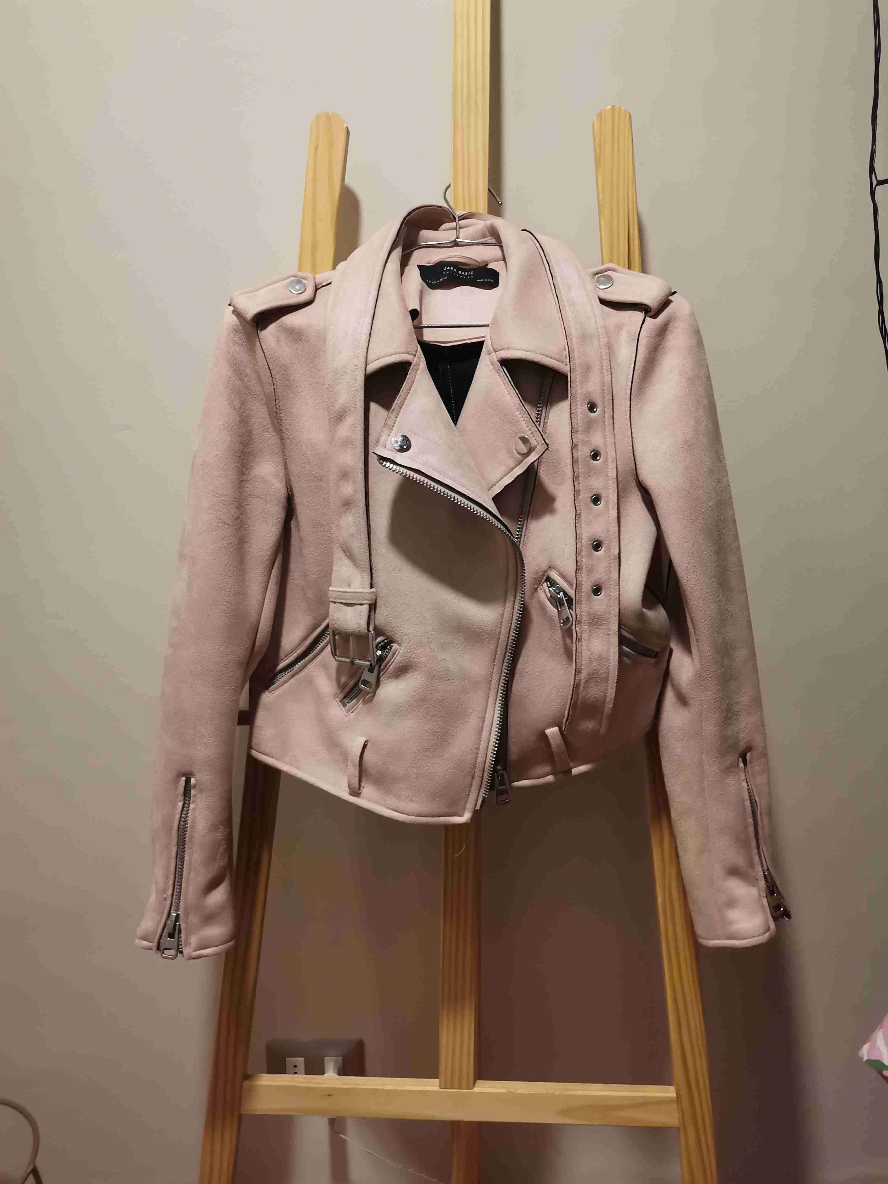 Chaqueta estilo moto rosada en buen estado. Ideal para un look casual o urbano. Con cinturón ajustable y cremalleras metálicas.