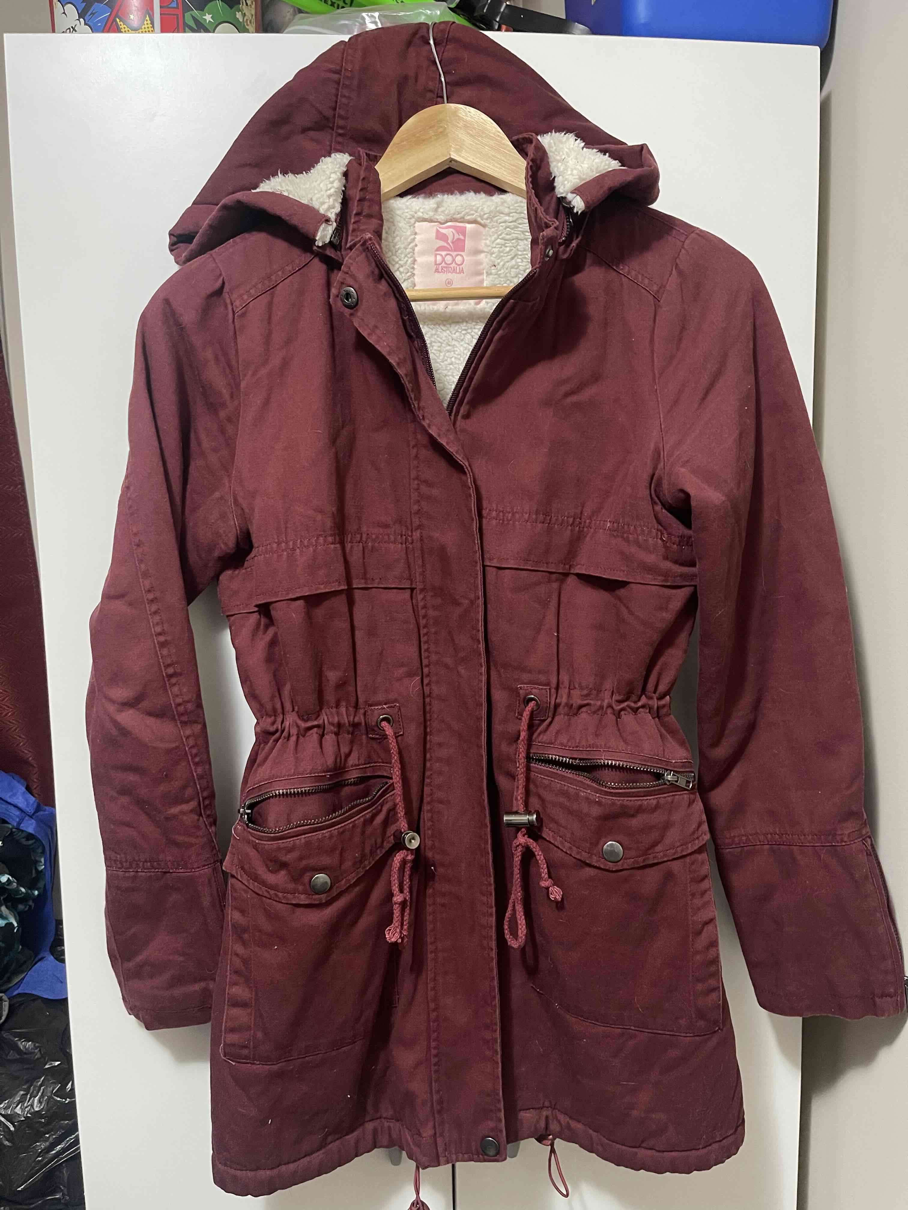 Chaqueta color burdeo con capucha y ajuste en la cintura. Ideal para días fríos. Interior chiporro parte central.