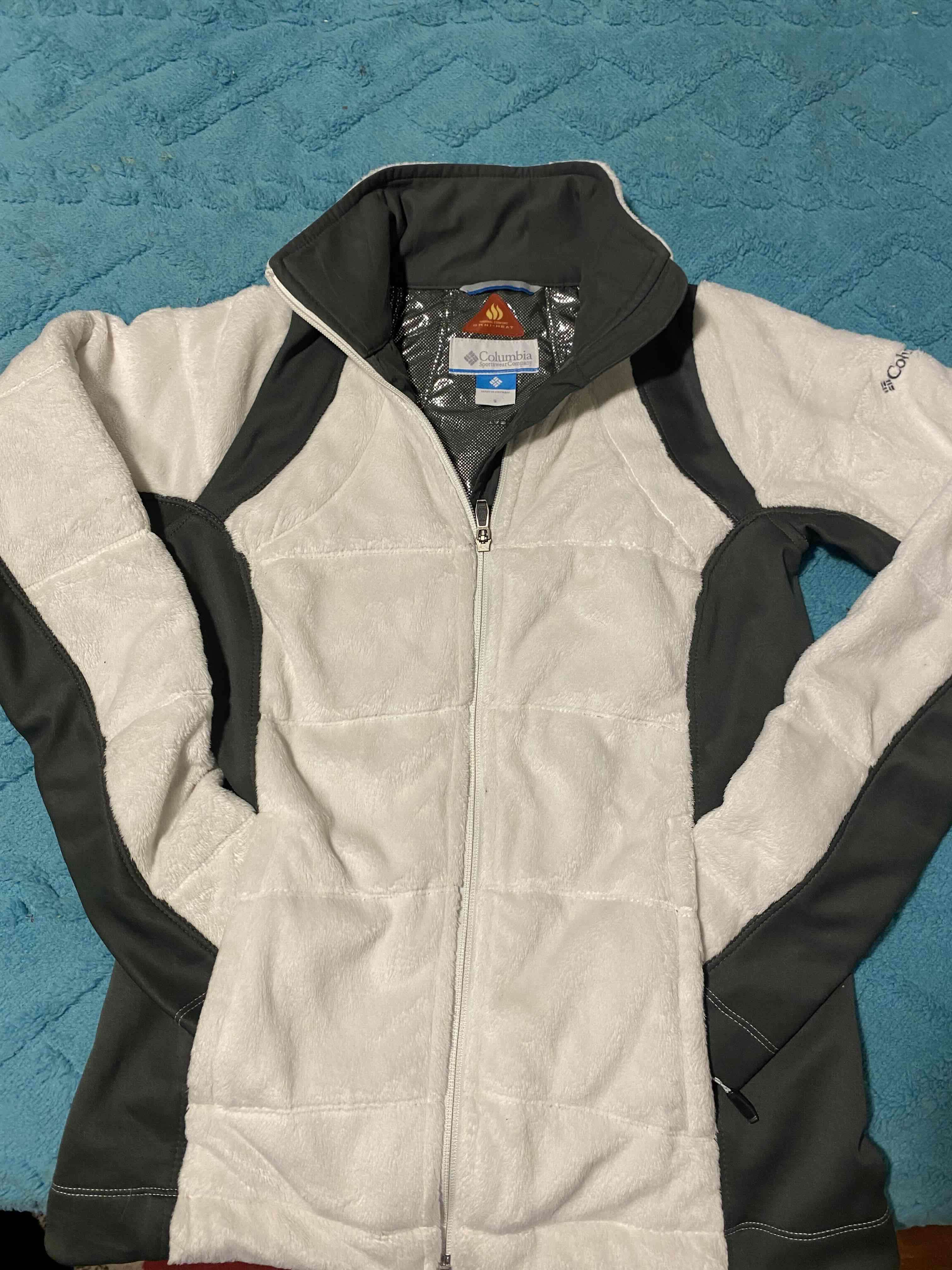 Chaqueta Columbia de polar, bicolor blanco y gris, ideal para clima frío. En buen estado, perfecta para actividades al aire libre