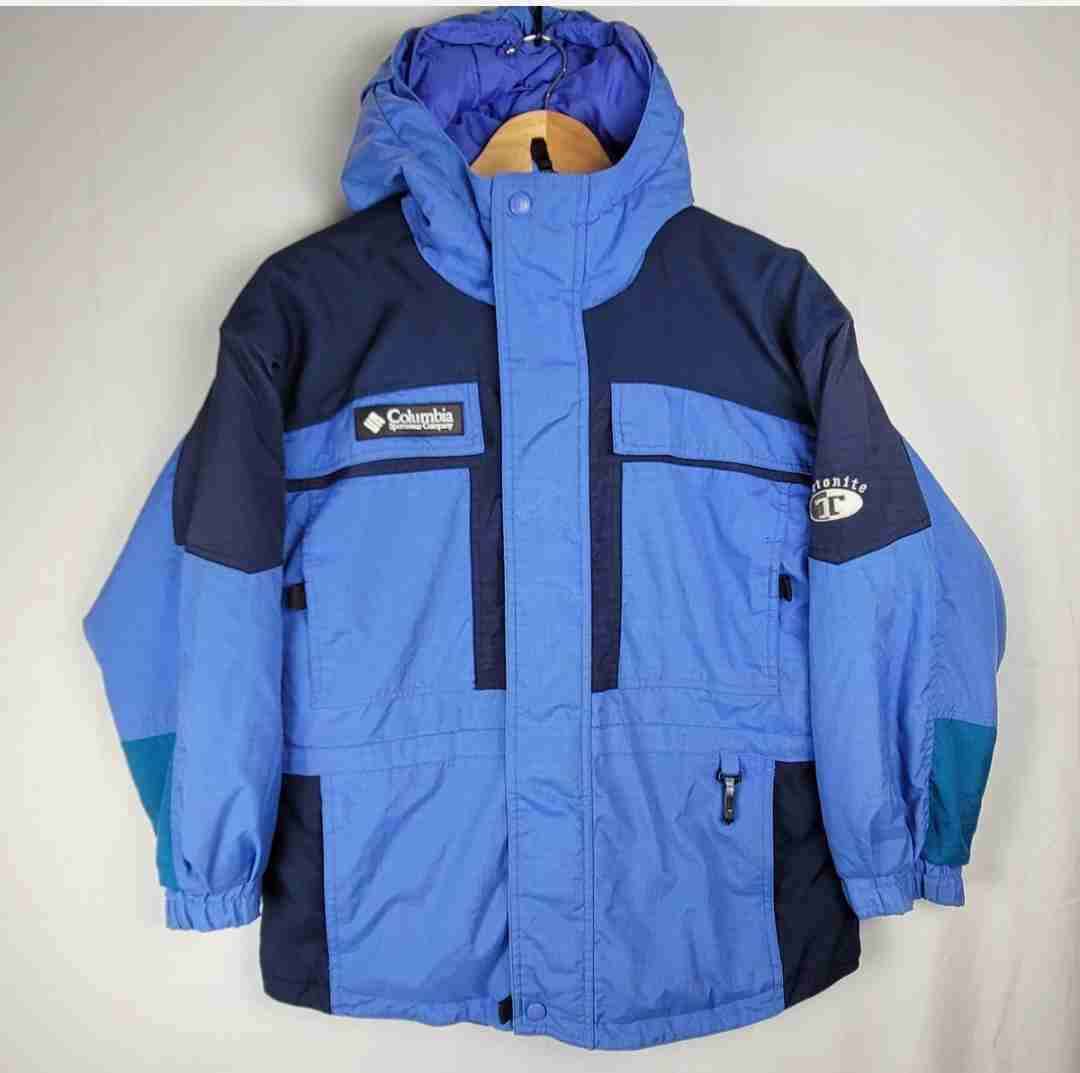 Chaqueta impermeable Columbia en tonos azul y negro. Ideal para el invierno, con capucha y varios bolsillos. En buen estado, perfecta para actividades al aire libre modelo de los años 90 talla 14-16 de niño sirve para talla S de mujer