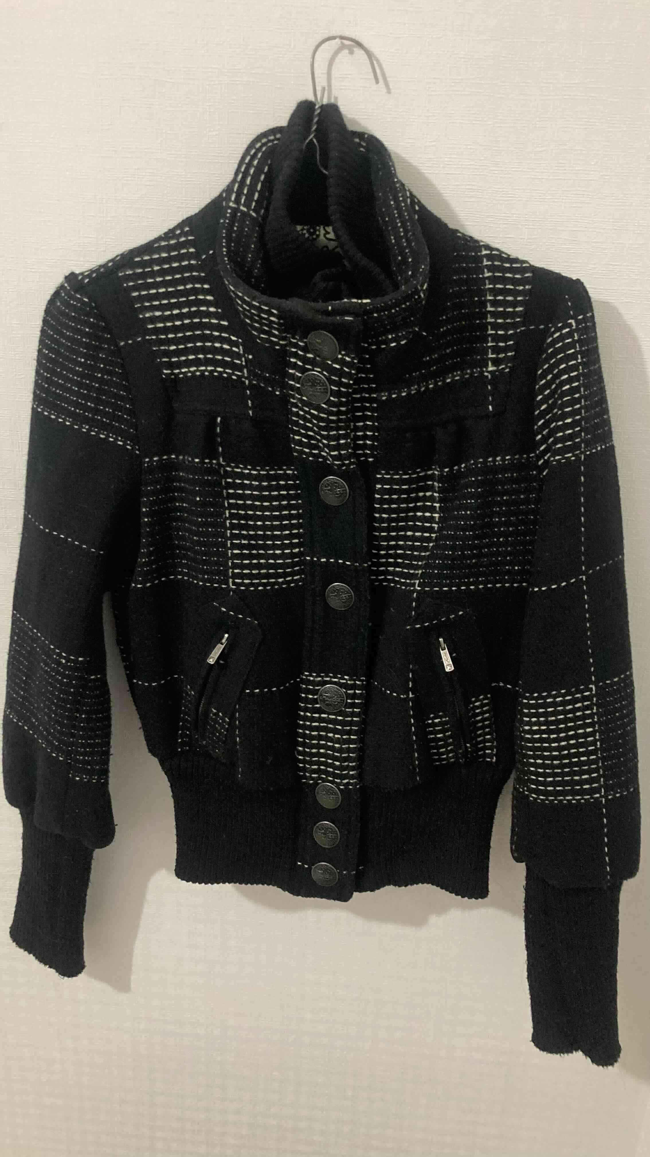 Chaqueta 40% lana ,60% acrílico con diseño de cuadros y cuello alto. Perfecta para días fríos, en buen estado ,dos bolsillos laterales con cierre y uno interior,cierre con botones y cierre.