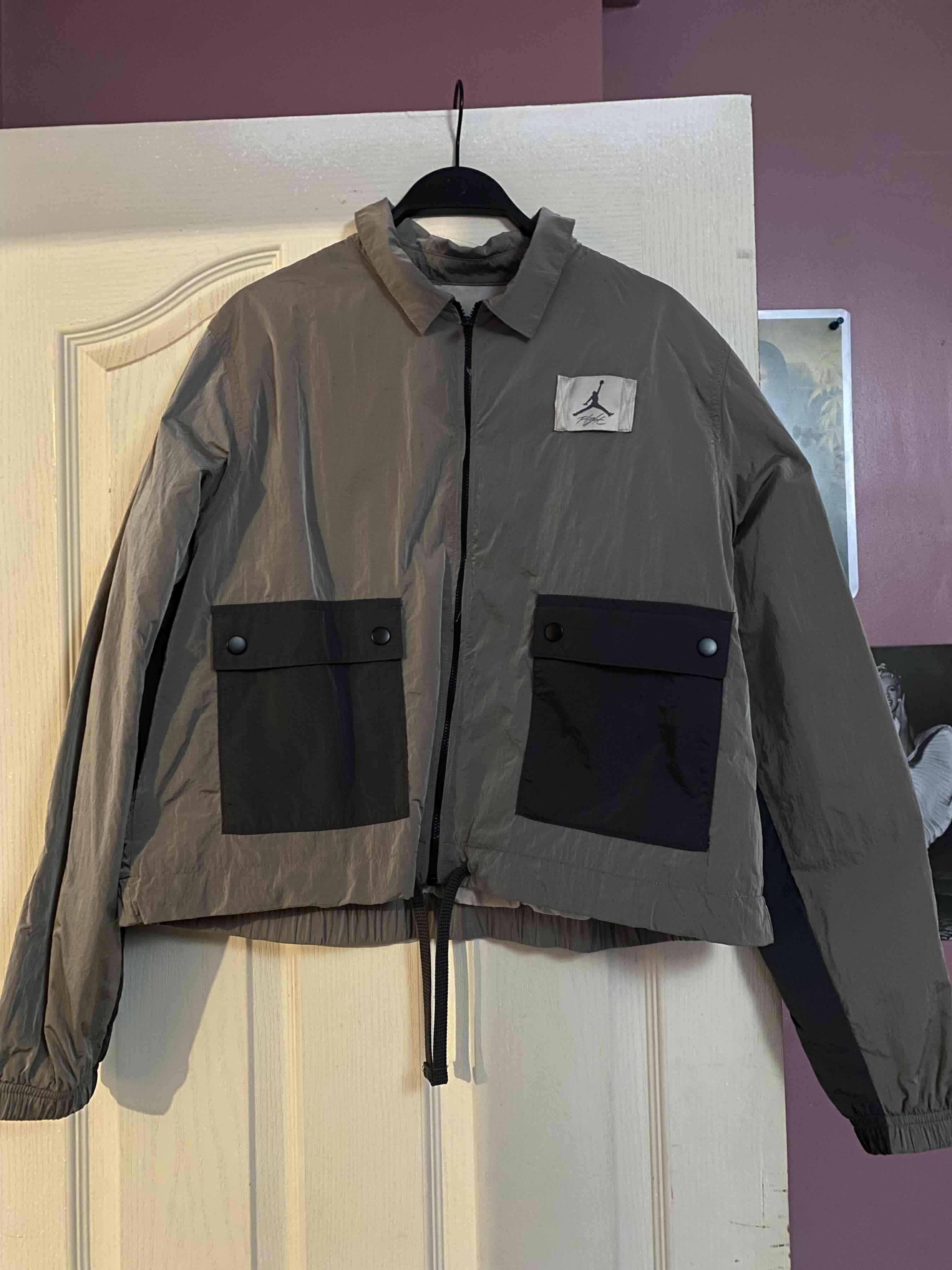 Chaqueta Jordan Flight Essentials en tonos gris y detalles negros, con diseño moderno y casual. Ideal para el uso diario. En buen estado, con pequeños signos de uso.