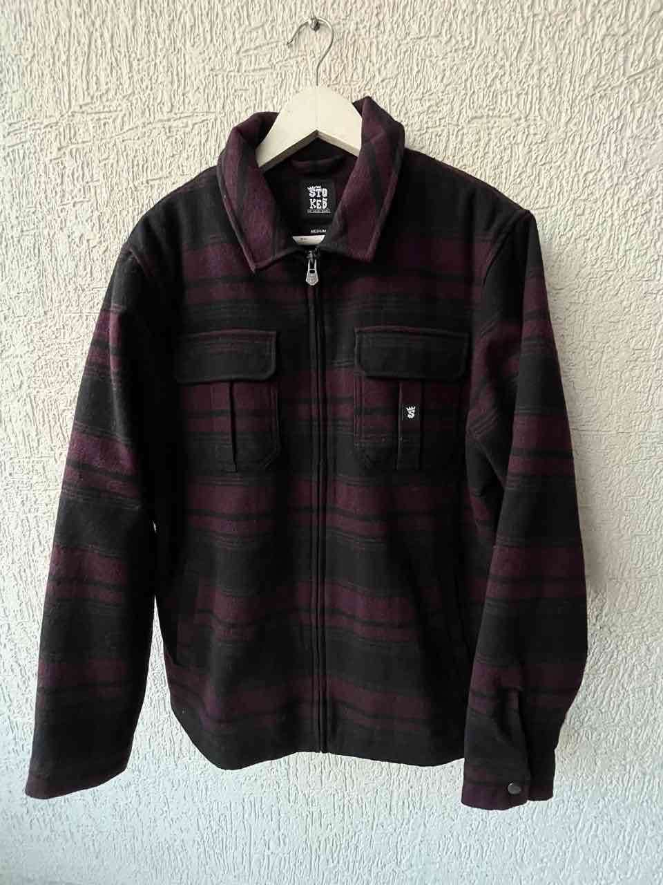 Chaqueta con diseño cuadrillé en negro y burdeo con chisporro, perfecta para el invierno. En buen estado, ideal para mantenerte abrigado.
