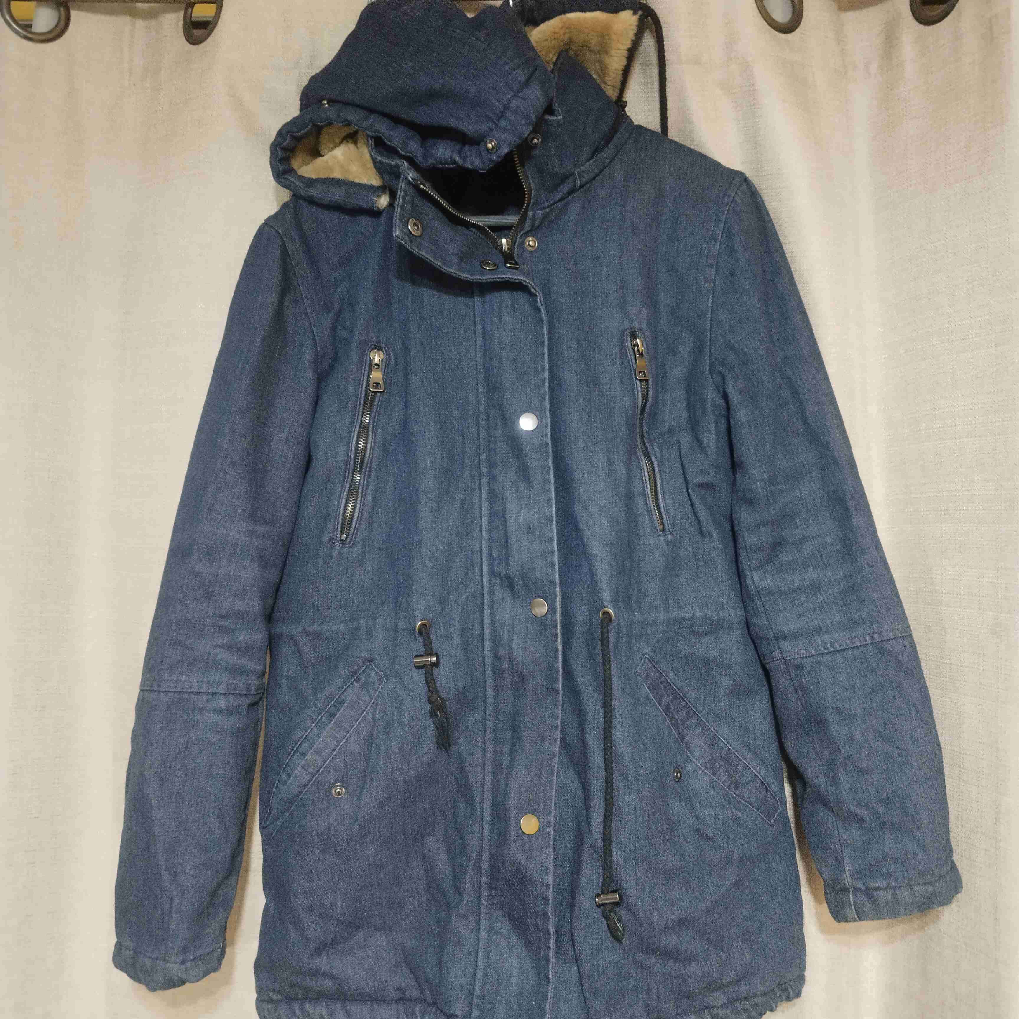 Chaqueta de mezclilla azul, cuerpo forrado en piel, mangas forro delgado. Gorro con piel, ambos desmontable .