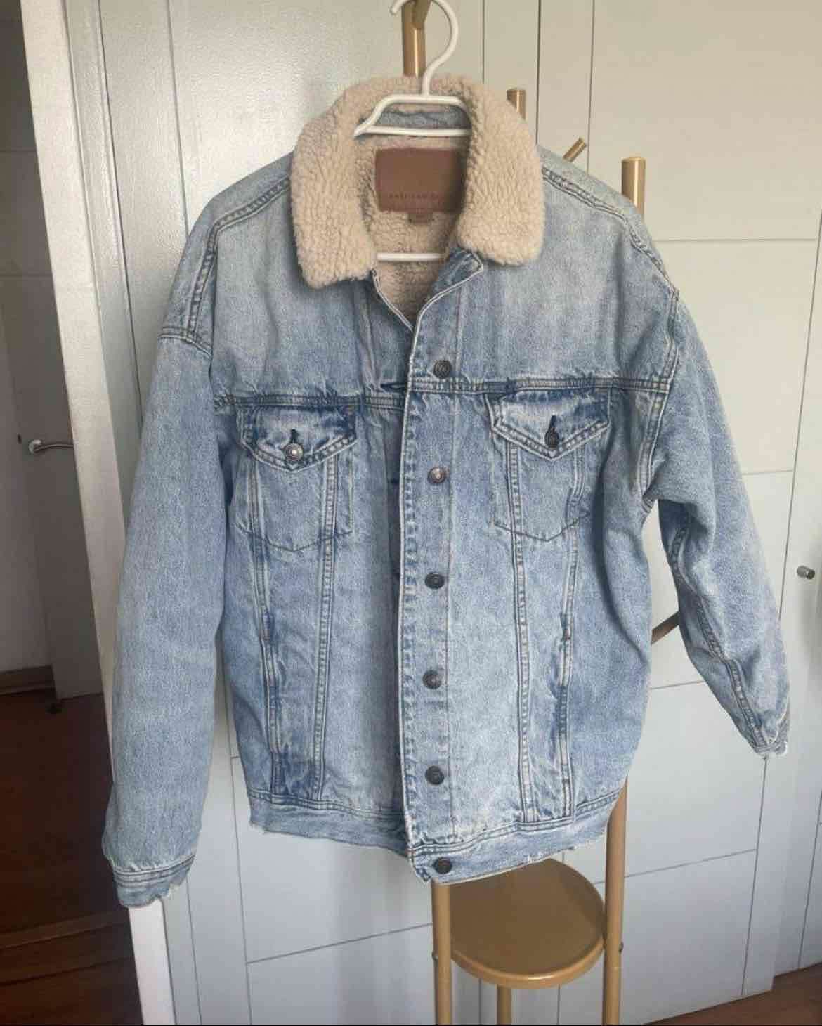 Chaqueta de mezclilla azul claro con interior de borrego. Ideal para días fríos, chaqueta de jeans con chiporro en su interior, unisex, talla L,muy calentita, marca american eagle, usada pero en buen estado, solo tiene detalles de desgaste en las orillas de los puños y un poco en el ruedo, pero le da ese toque de desgaste que se usa hoy en dia en las prendas de jeans.