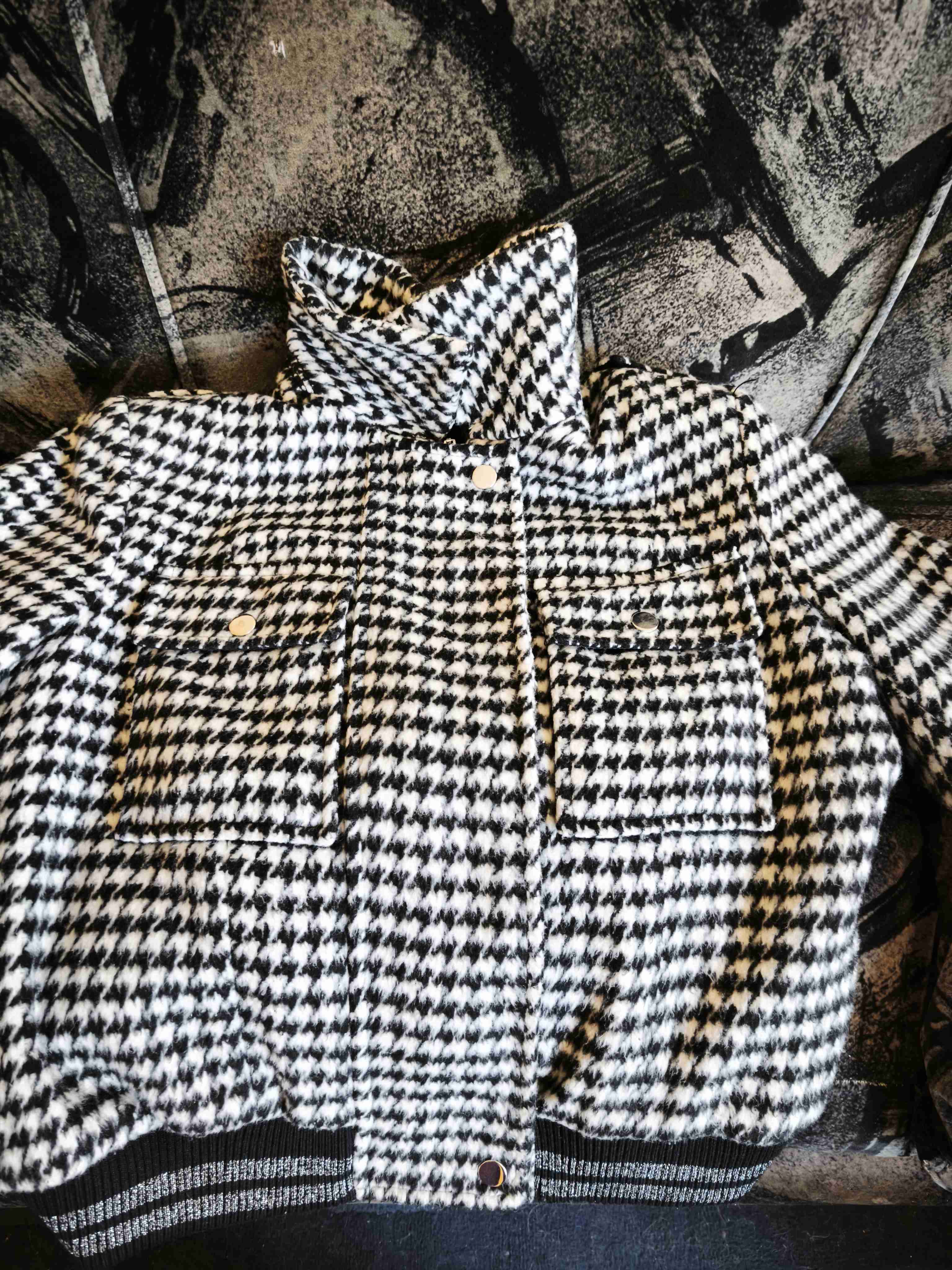 Elegante chaqueta de lana con patrón de pata de gallo en blanco y negro. Ideal para el otoño, en buen estado general.