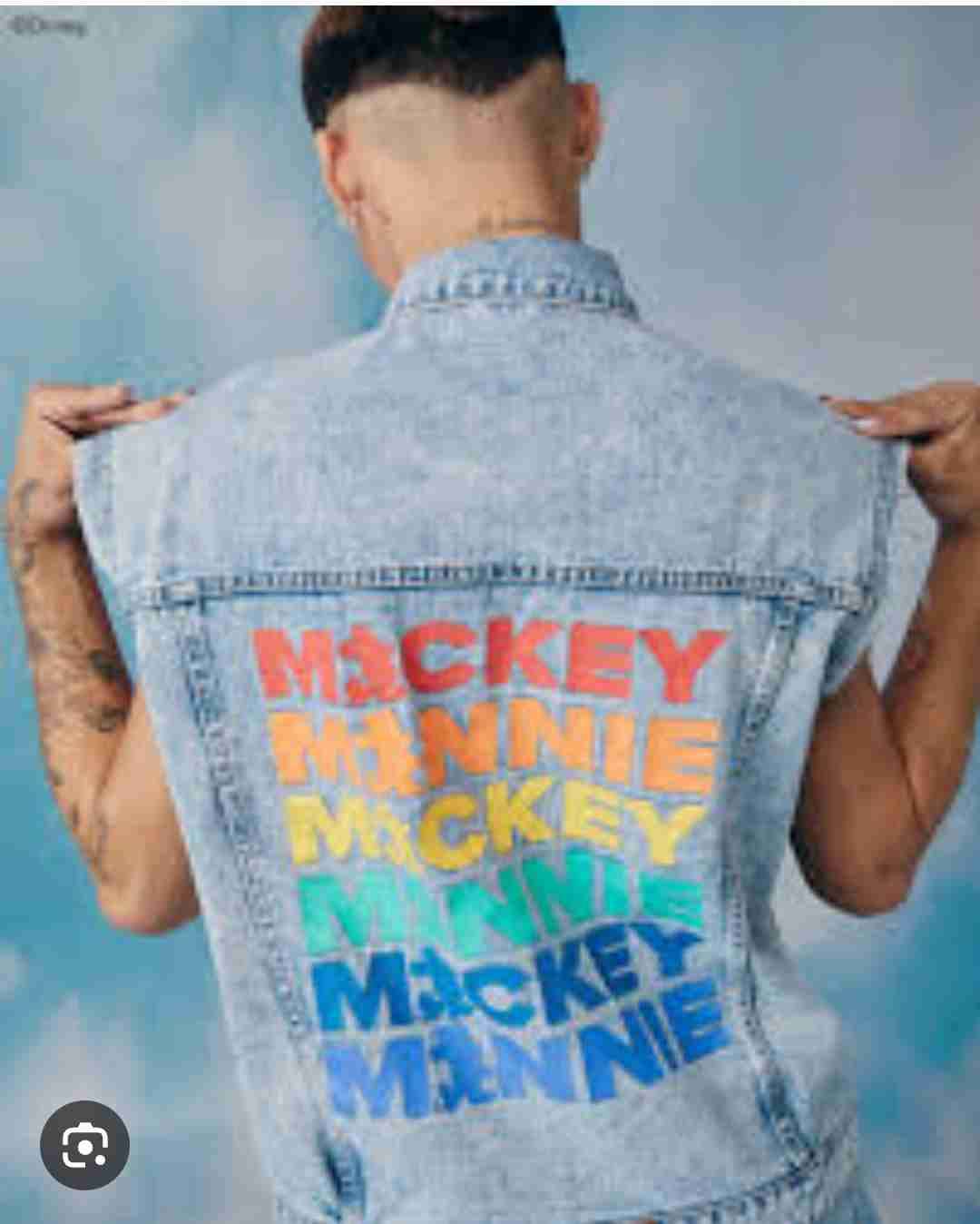 Chaqueta de mezclilla sin mangas con diseño colorido de Mickey Mouse, Colección PRIDE de Disney para Sybilla. El estado es nuevo con etiqueta, ideal para looks casuales, unisex.