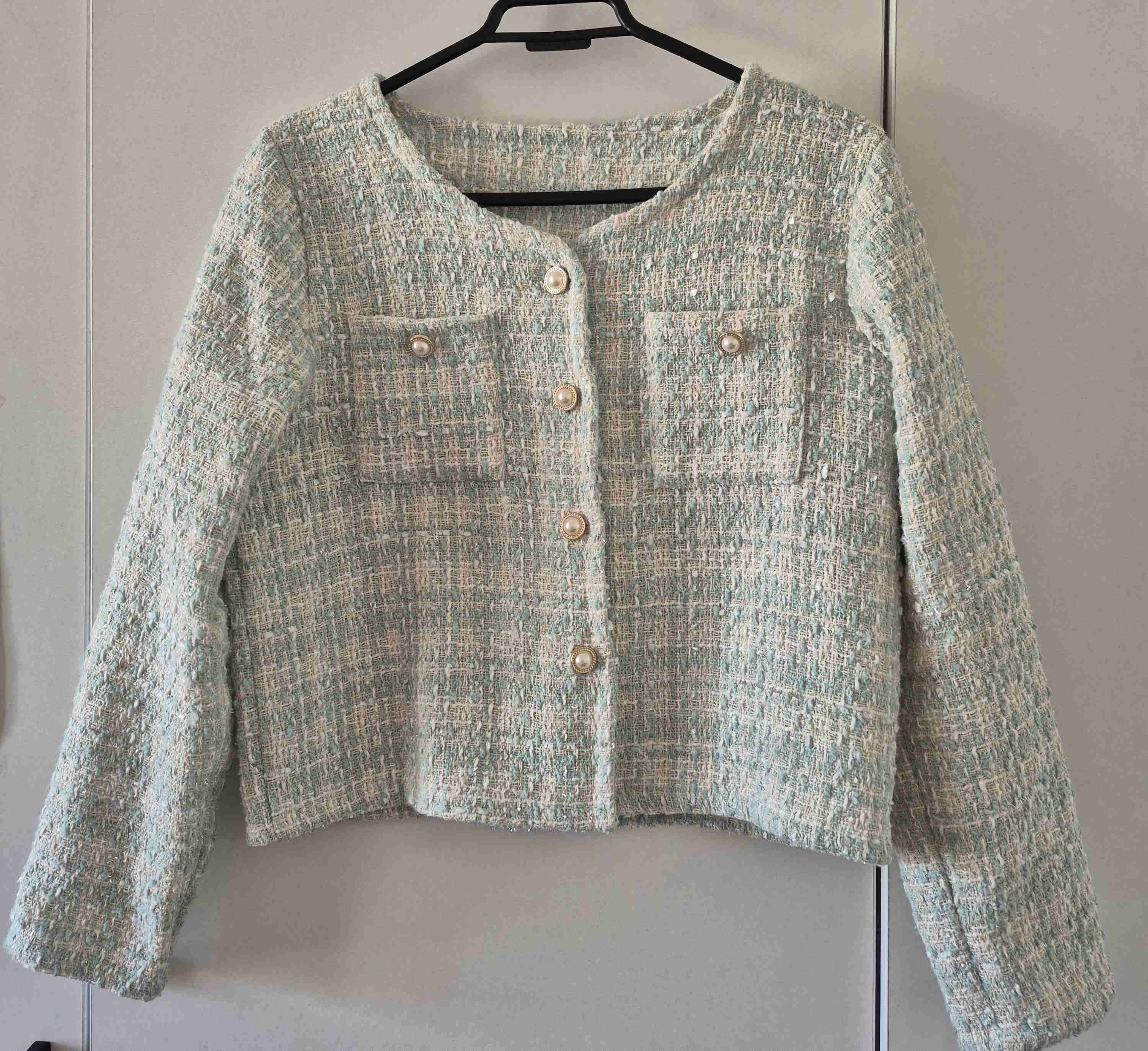 Chaqueta estilo tweed, color celeste claro, en buen estado. Ideal para ocasiones casuales o formales. Comprada en Corea , nueva sin uso