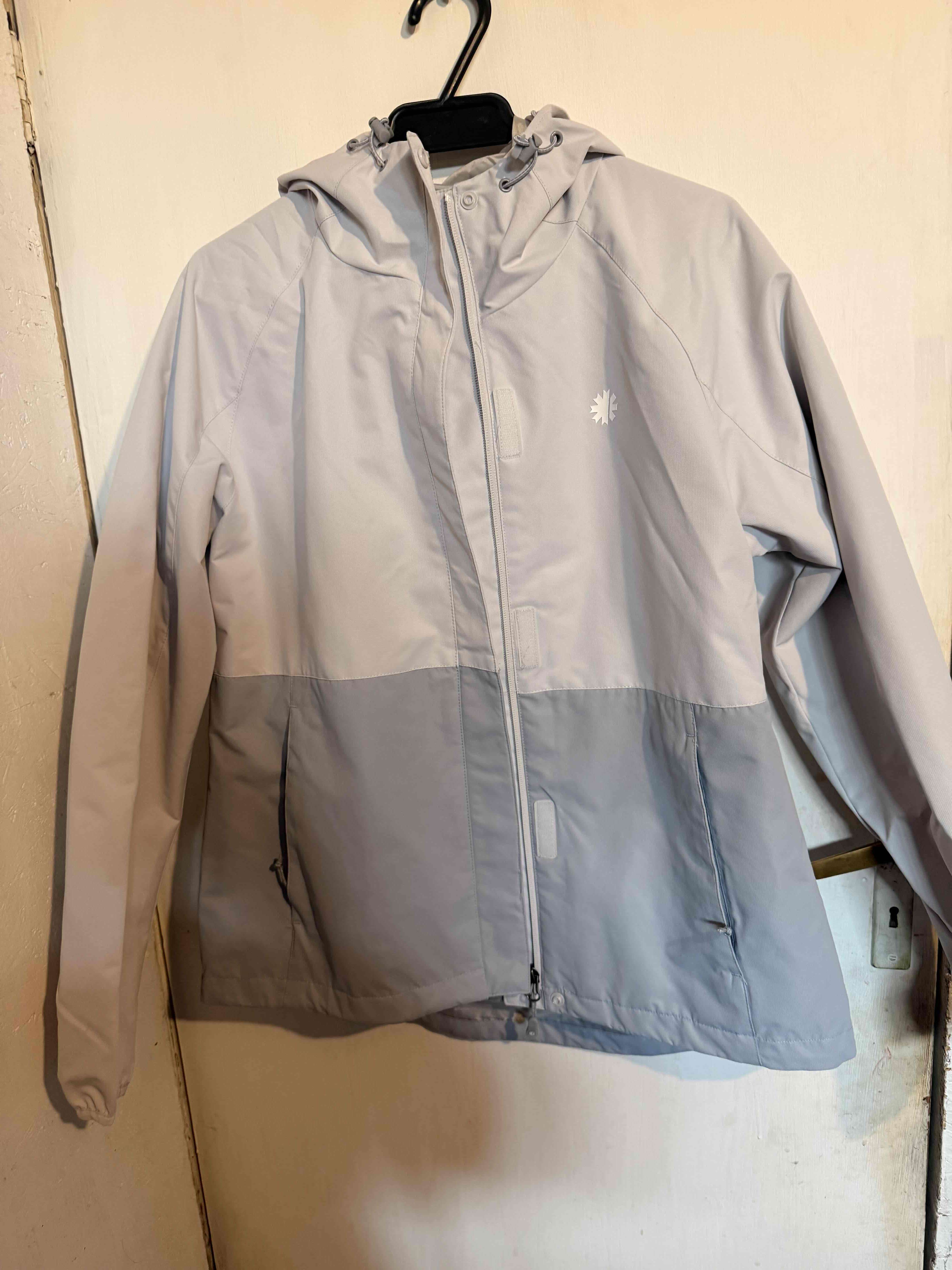 Chaqueta de algodón gris con diseño casual y capucha. Ideal para días frescos, en buen estado general. Poco uso. Corta viento ligero