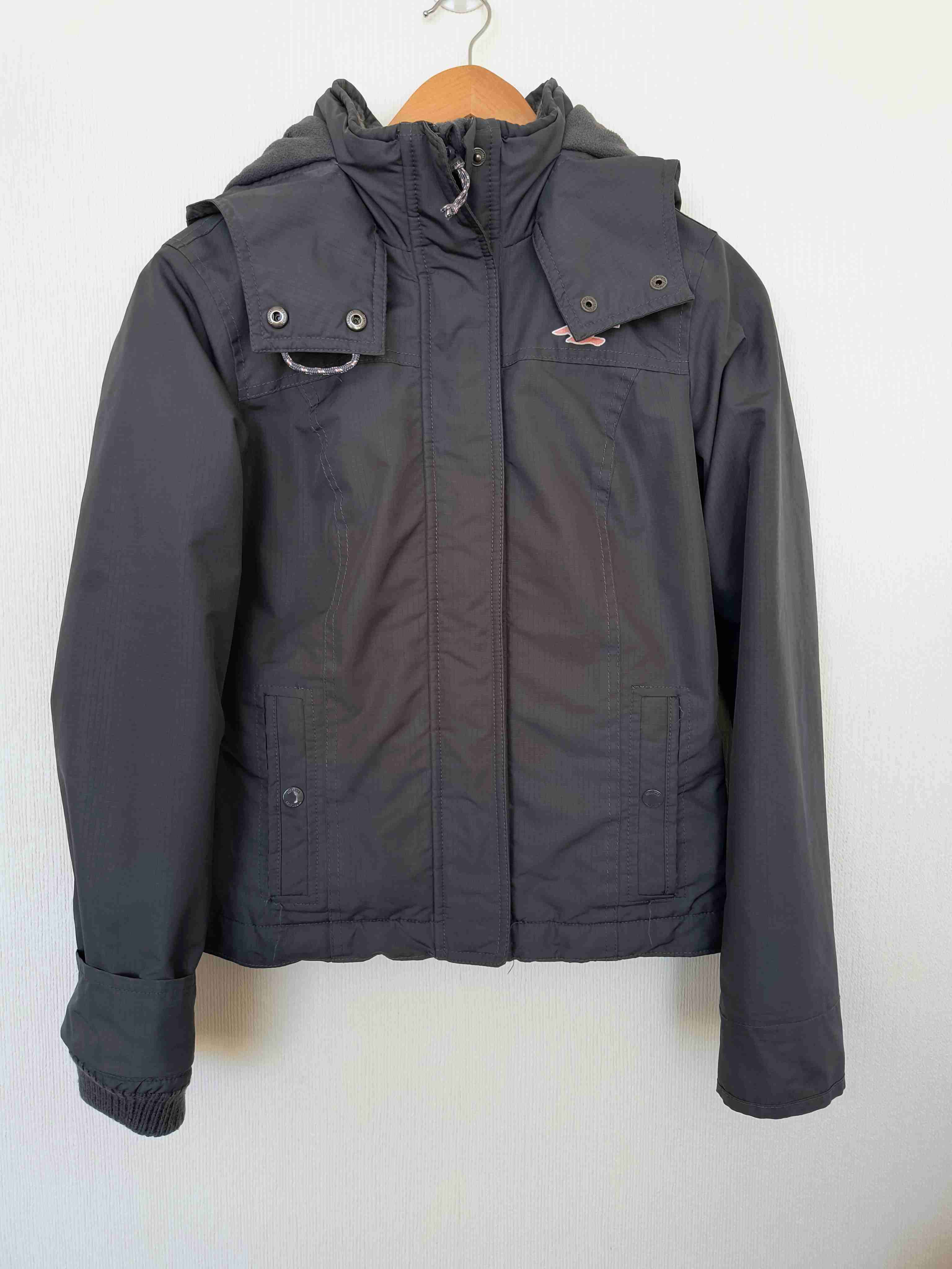 Chaqueta negra para todo clima, con capucha desmontable y bolsillos funcionales. Talla S, forrada por dentro con micropolar, calentita e impermeable.