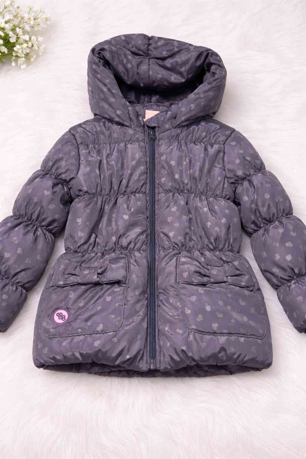 Linda chaqueta infantil gris con capucha, perfecta para el invierno. En buen estado, con diseño acolchado y detalles de corazones.