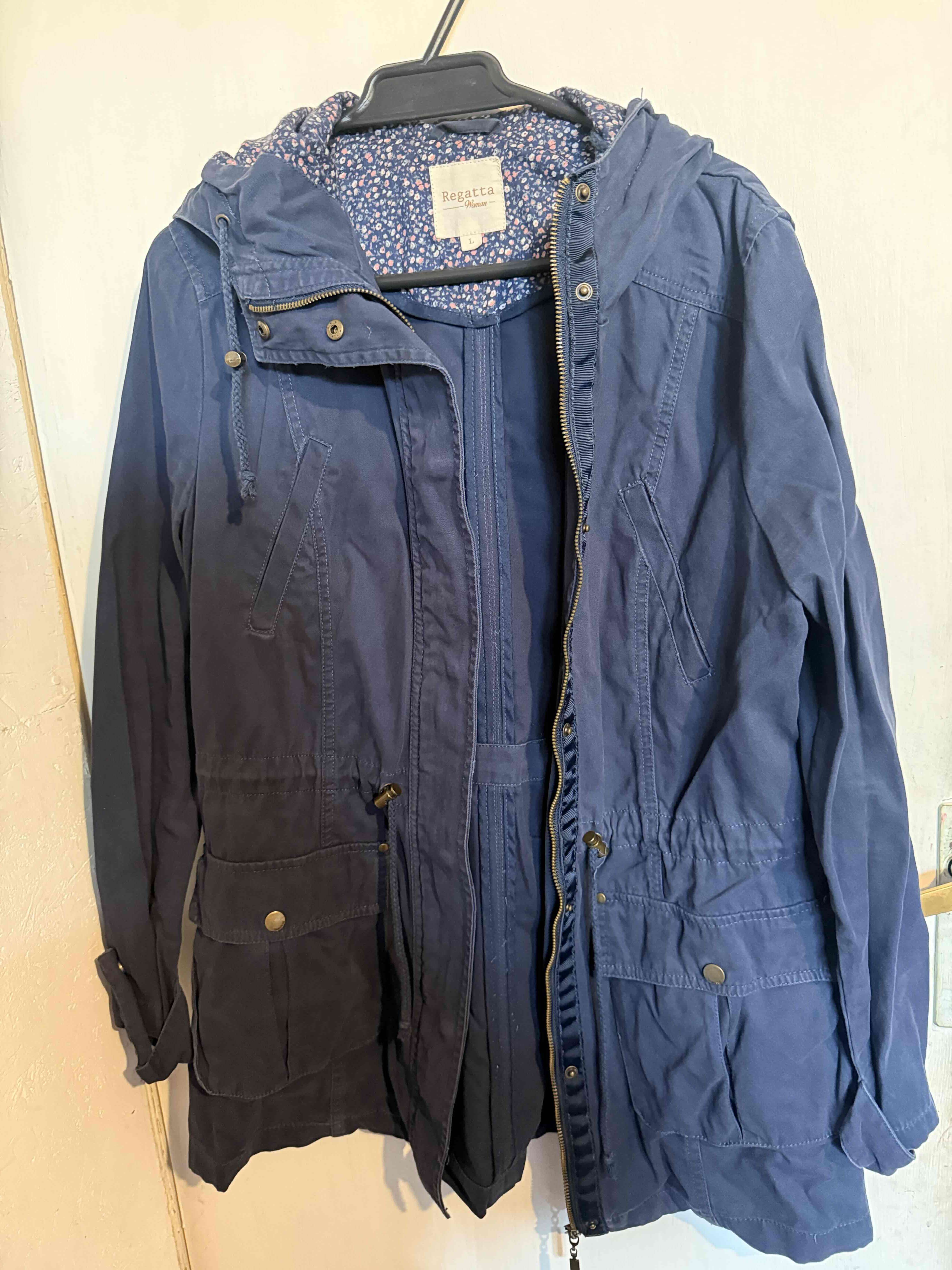 Chaqueta delgada azul con diseño interior floral. En buen estado. Largo a media pierna, se ajusta en la cintura. Marca regatta pertenece a Ripley.
