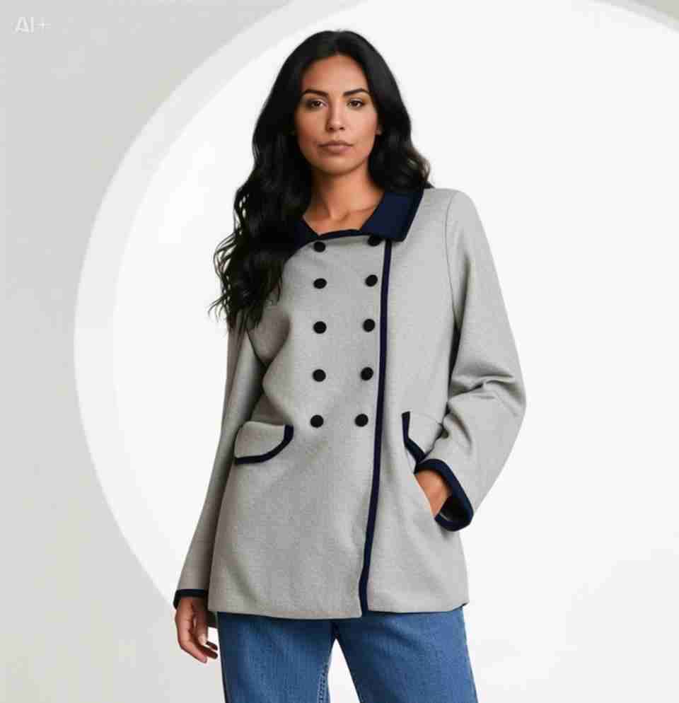 Chaqueta gris con detalles en negro, estilo elegante para días fríos. Buena condición, ideal para ocasiones casuales. Parte de la colección Novameli. Moda sostenible. Ancho (de axila a axila) 54 cm Largo Total 78 cm