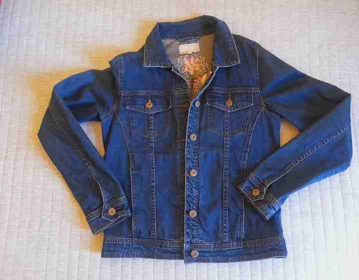 Chaqueta de mezclilla azul oscuro, perfecta para el otoño. En buen estado, con botones metálicos y estilo clásico.