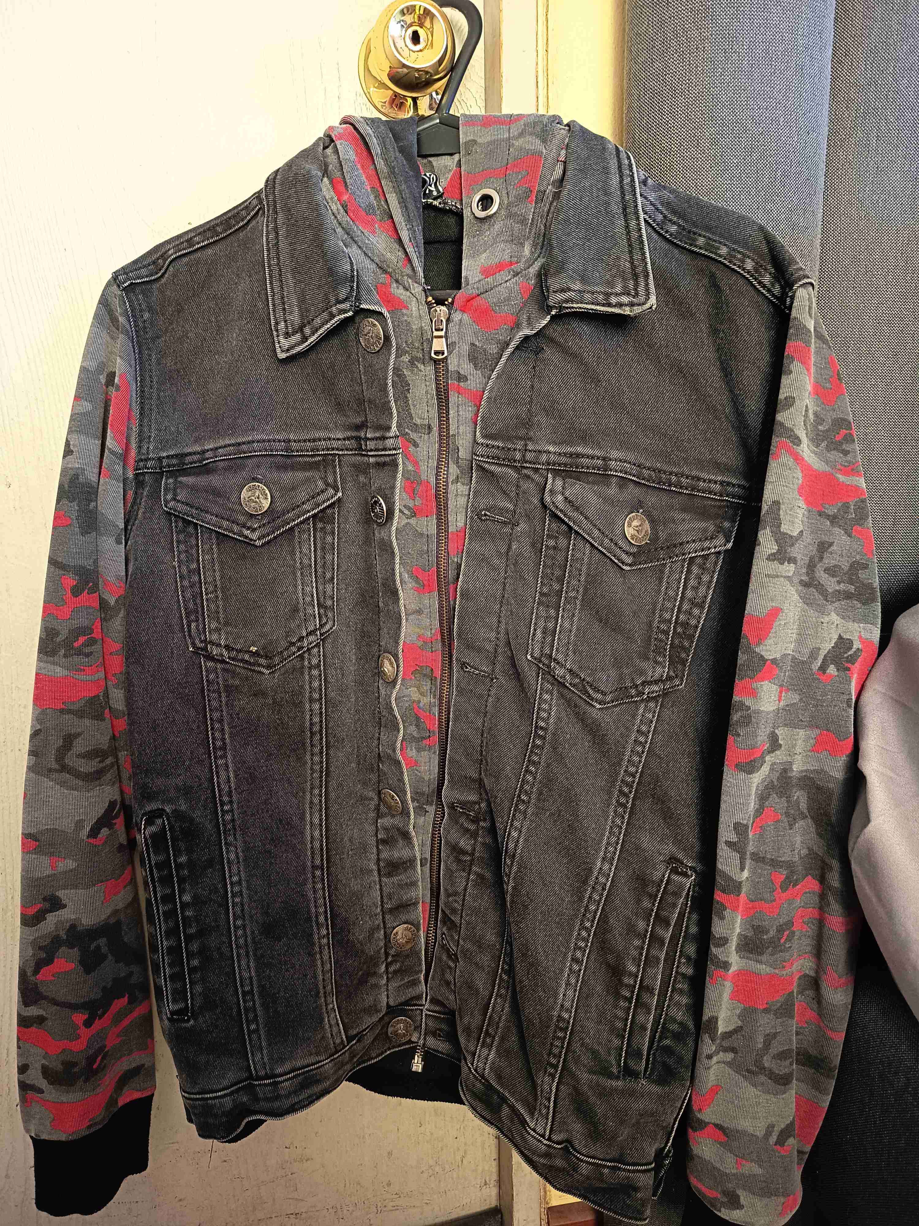 Chaqueta estilo urbana, mezcla única de mezclilla y con estampado de camuflaje en las mangas y gorro, su detalle propio del uso, pero en buenas condiciones, Ideal para un look casual o informal.