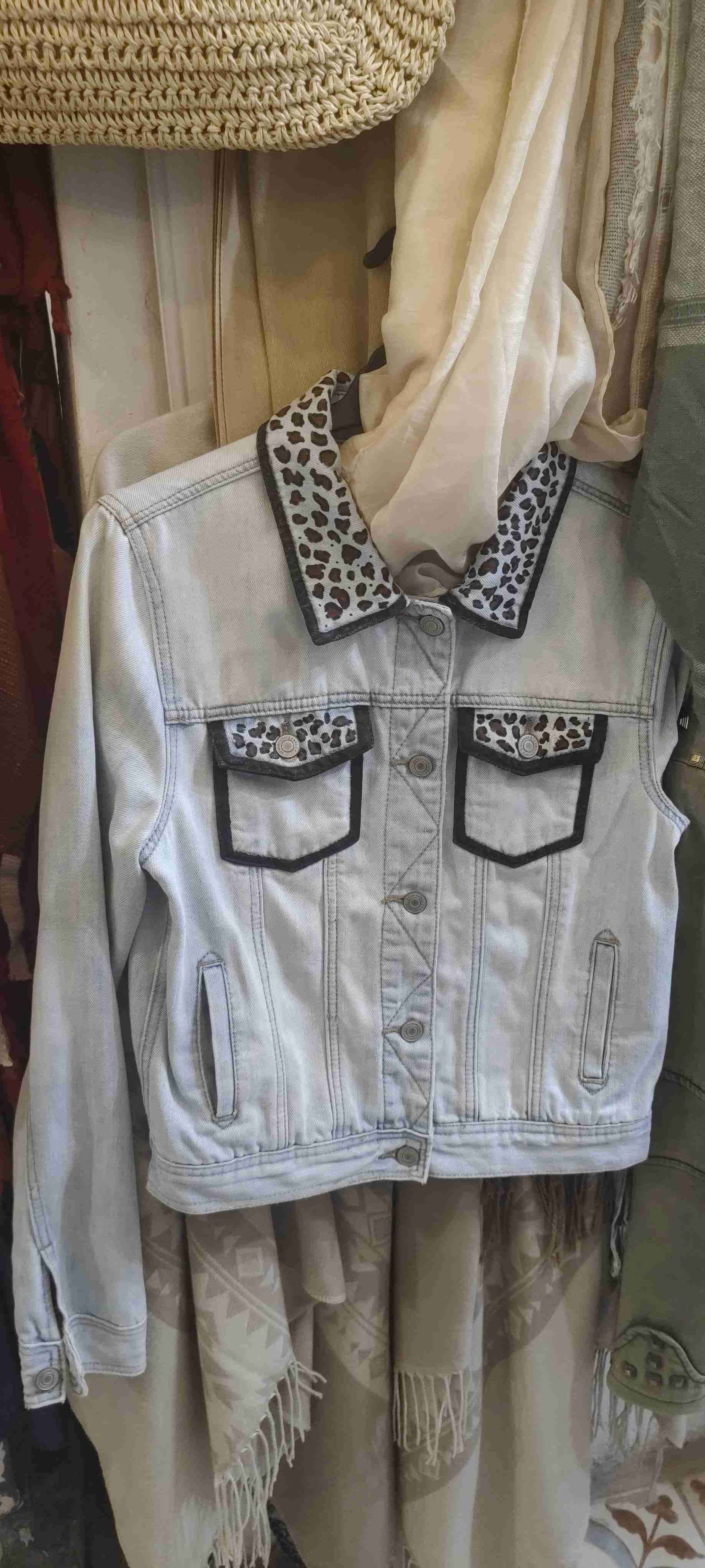 Chaqueta de mezclilla azul claro con collar y bolsillos de estampado animal print. Ideal para un look casual y moderno. En buen estado. Talla M