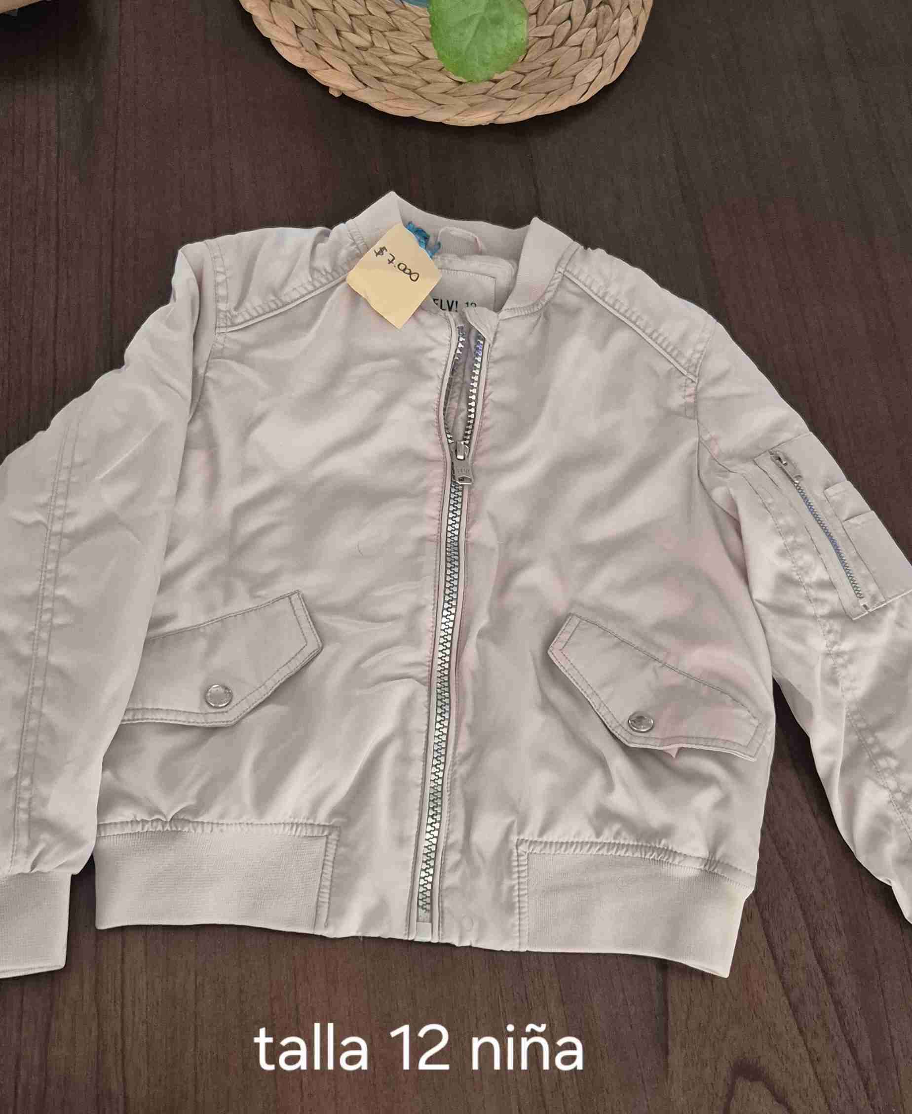 Chaqueta beige para niña, talla 12. Ideal para días frescos, con cierre frontal y bolsillos.